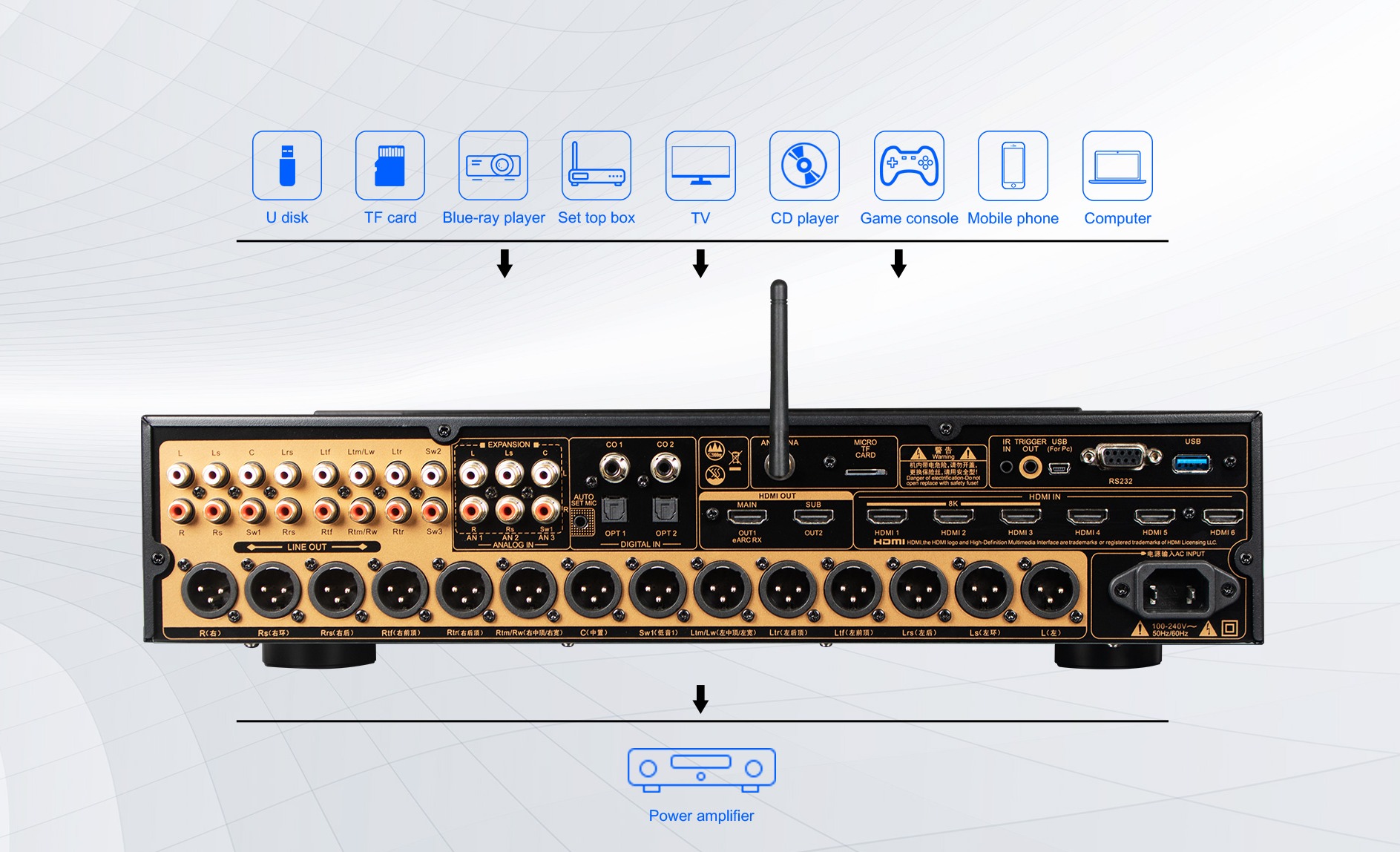 يدعم حتى 7.1.6 أو 9.1.4 قناة مع مخارج متوازنة، أو 7.3.6 / 9.3.4 مع مخارج غير متوازنة. بفضل مخارج مضخم الصوت المتعددة (XLR وRCA)، يتكيف جهاز AT-500 مع أي تصميم غرفة أو إعداد مكبر صوت تقريبًا.