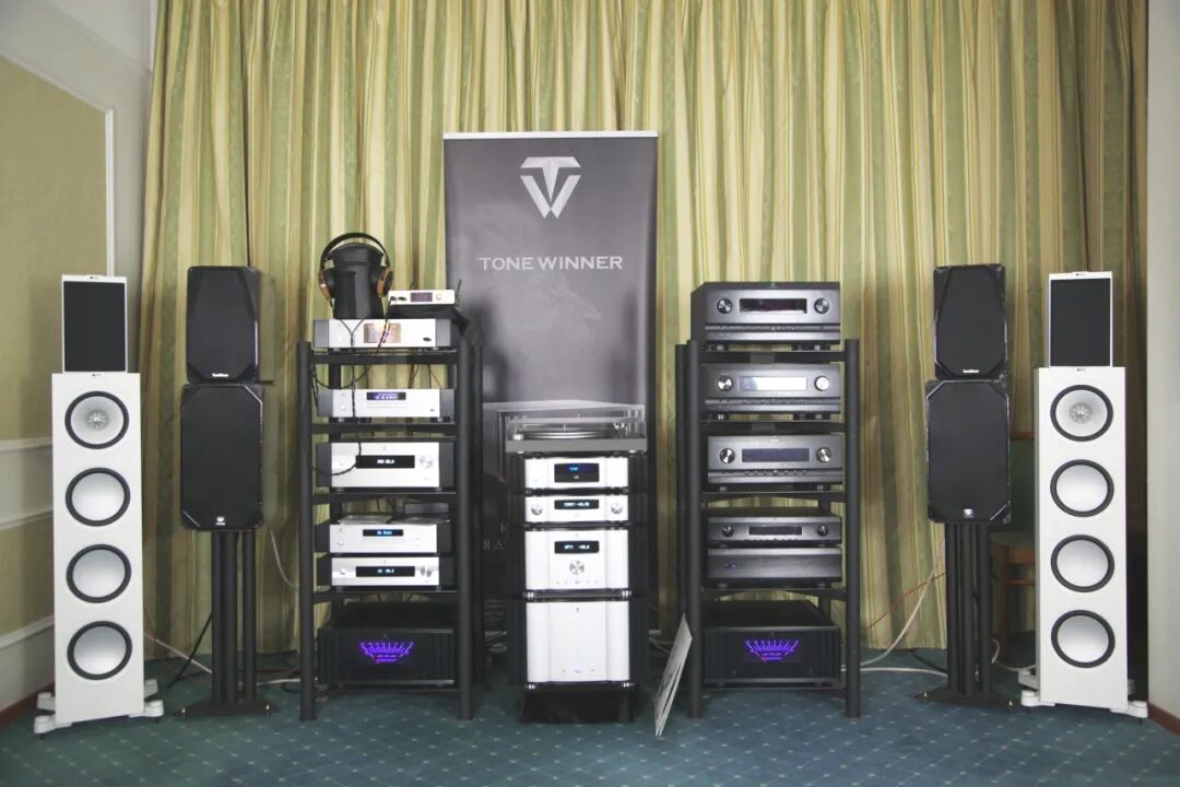 تشير استجابة التردد إلى نطاق الترددات التي يمكن لنظام الصوت إنتاجها، من الأدنى إلى الأعلى. تختلف مكبرات الصوت الأرضية ومكبرات الصوت المكتبية في هذا الصدد بسبب تصميمها. على سبيل المثال، مكبرات صوت Tonewinner TD-9 للرفوف لديها نطاق تردد يتراوح من 40 هرتز إلى 25 كيلو هرتز، في حين أن مكبرات صوت TD-C8 الأرضية يتراوح من 35 هرتز إلى 25 كيلو هرتز.