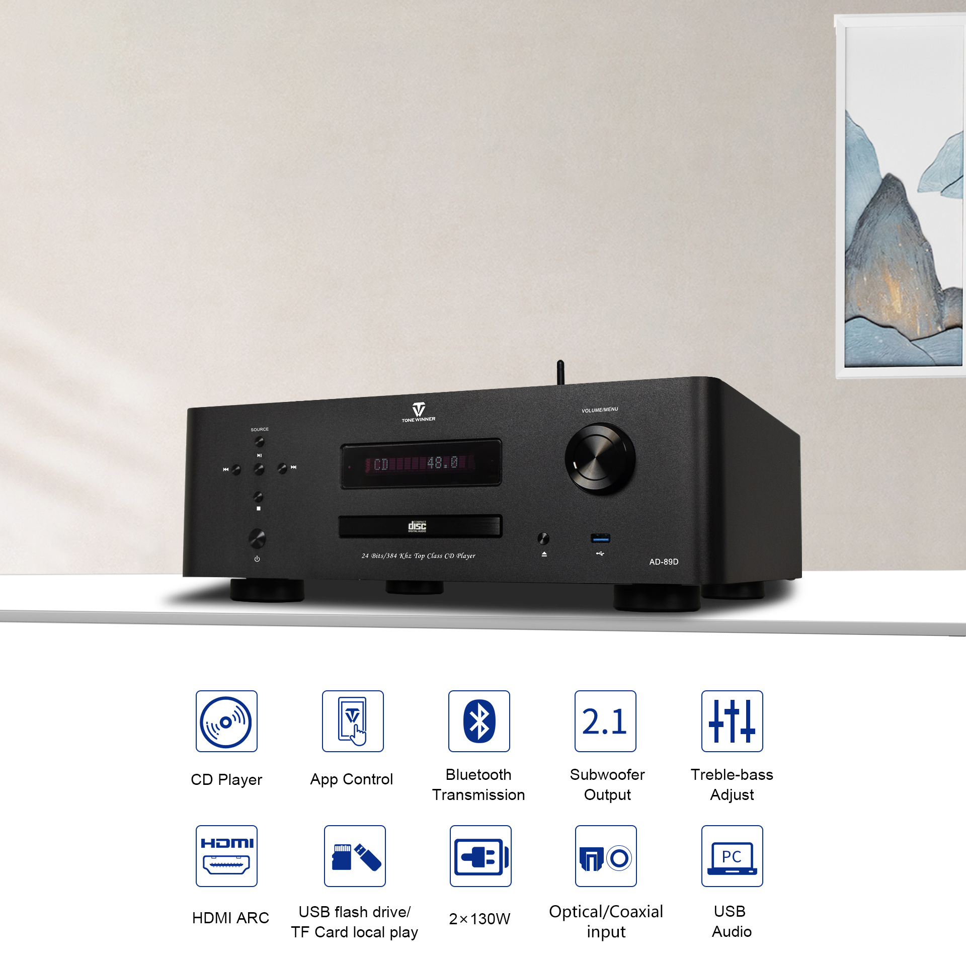 AD-89D هو مضخم صوت متكامل عالي الدقة، صُمم بخبرة Tonewinner التقنية التي تمتد لثلاثين عامًا، لتلبية احتياجات السوق من الوظائف المتعددة. يجمع هذا المنتج بين وظائف متعددة مثل مشغل الأقراص المدمجة، ومشغل الوسائط المتدفقة، وفك تشفير ما قبل التضخيم، ومضخم الصوت. تتميز الدائرة الكهربائية بالنضج والثبات، والمواد المستخدمة متينة وعالية الجودة، مما يجعل المنتج موثوقًا ومتينًا. يتميز بصوت نقي وعميق، وأداء اقتصادي مرتفع للغاية، وهو تحفة فنية تمثل الجيل الجديد من مضخمات الصوت الرقمية عالية الدقة.