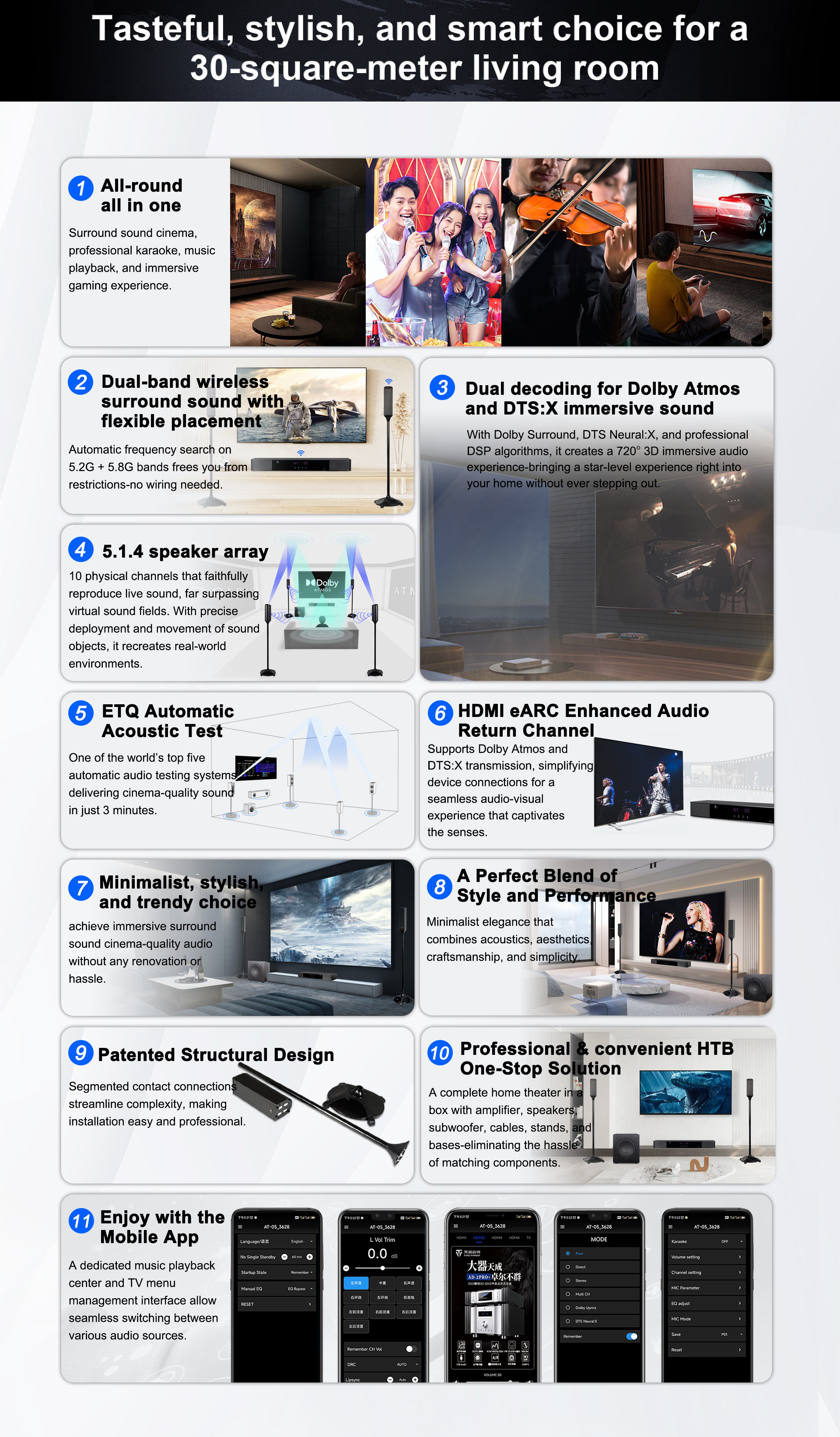 Tonewinner YX-02P هو نظام مسرح منزلي متكامل يجمع بين صوت Dolby Atmos المحيطي، وتجربة KTV احترافية، وموسيقى Hi-Fi، وألعاب الفيديو. يتميز بمصفوفة مكبرات صوت 5.1.4 قناة، تدعم تقنيتي Dolby Atmos وDTS:X. كما يدعم الفيديو بدقة 4K، مما يوفر تجربة غامرة لا مثيل لها. يوفر النظام صوتًا محيطيًا احترافيًا بـ 5.1.4 قناة للكاريوكي، والتحكم في تطبيقات الهواتف الذكية، وتوافقًا مع بطاقات USB/TF، ونقلًا لاسلكيًا بتقنية Bluetooth بدون فقدان، وميزة إعادة الصوت eARC.