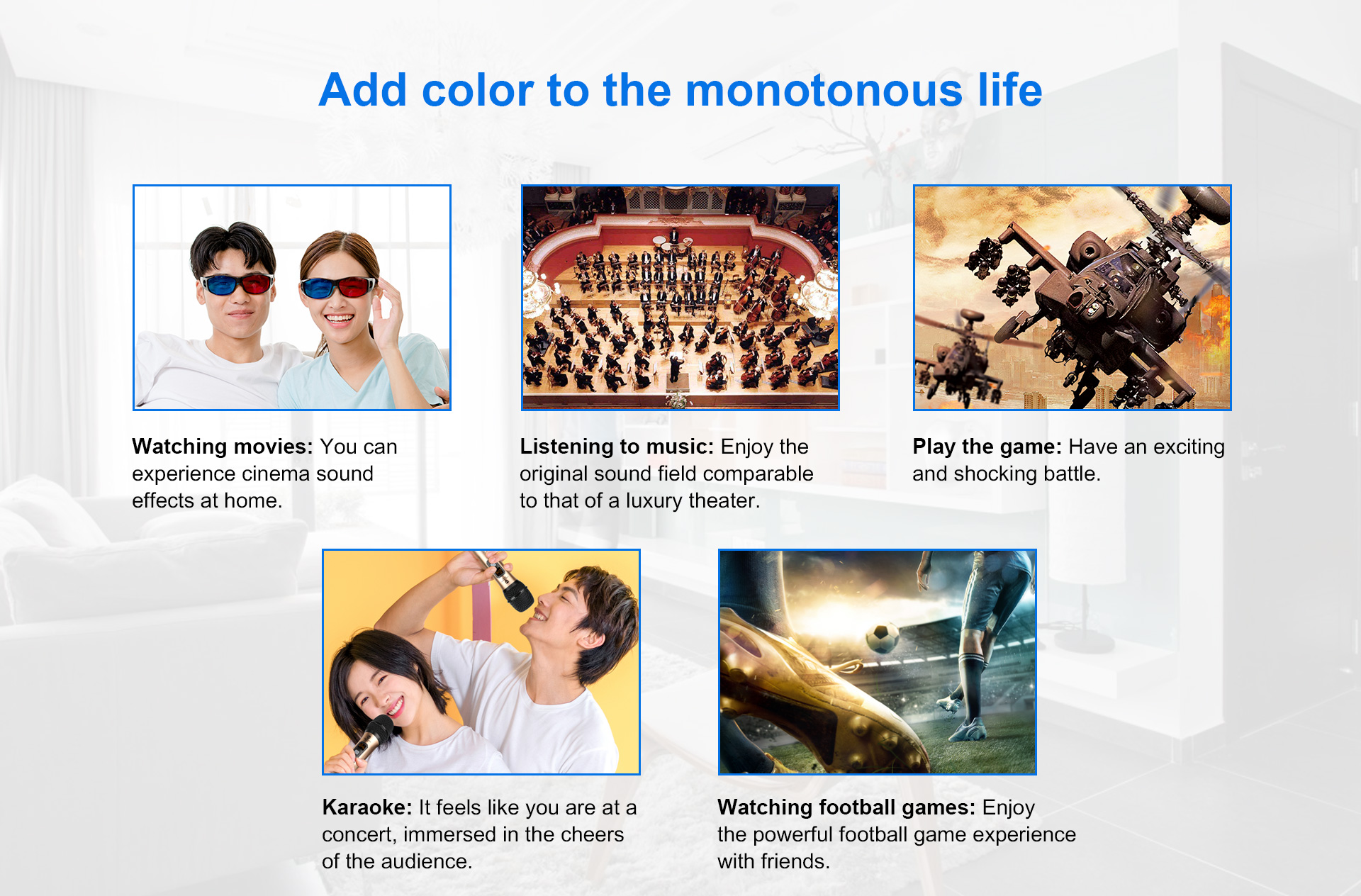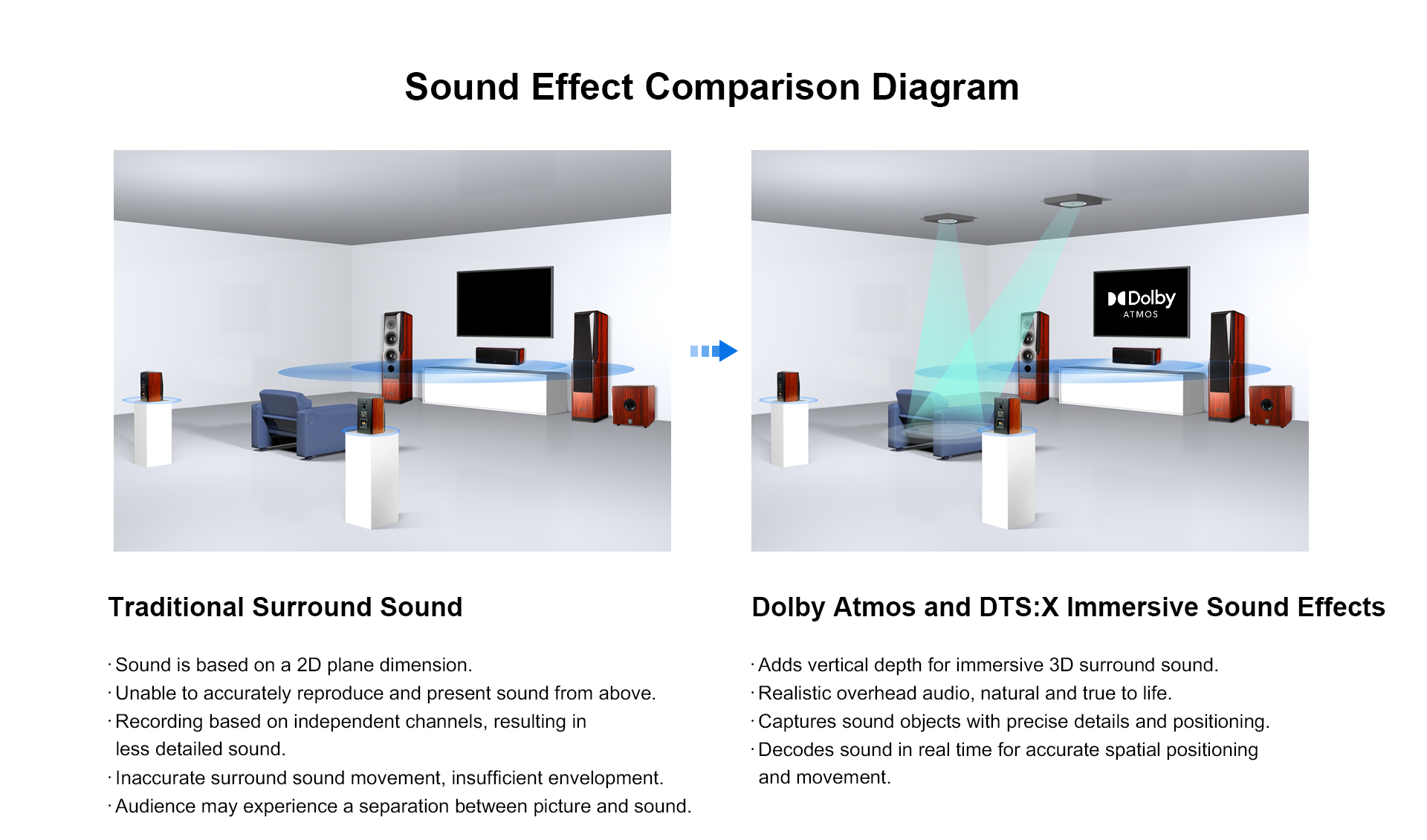 من خلال تحديد إشارات تحديد المواقع المكانية في المسارات الصوتية التقليدية المجسمة أو متعددة القنوات واستخدام خوارزميات DSP الاحترافية، يتم إنشاء تأثير صوتي ثلاثي الأبعاد غامر.