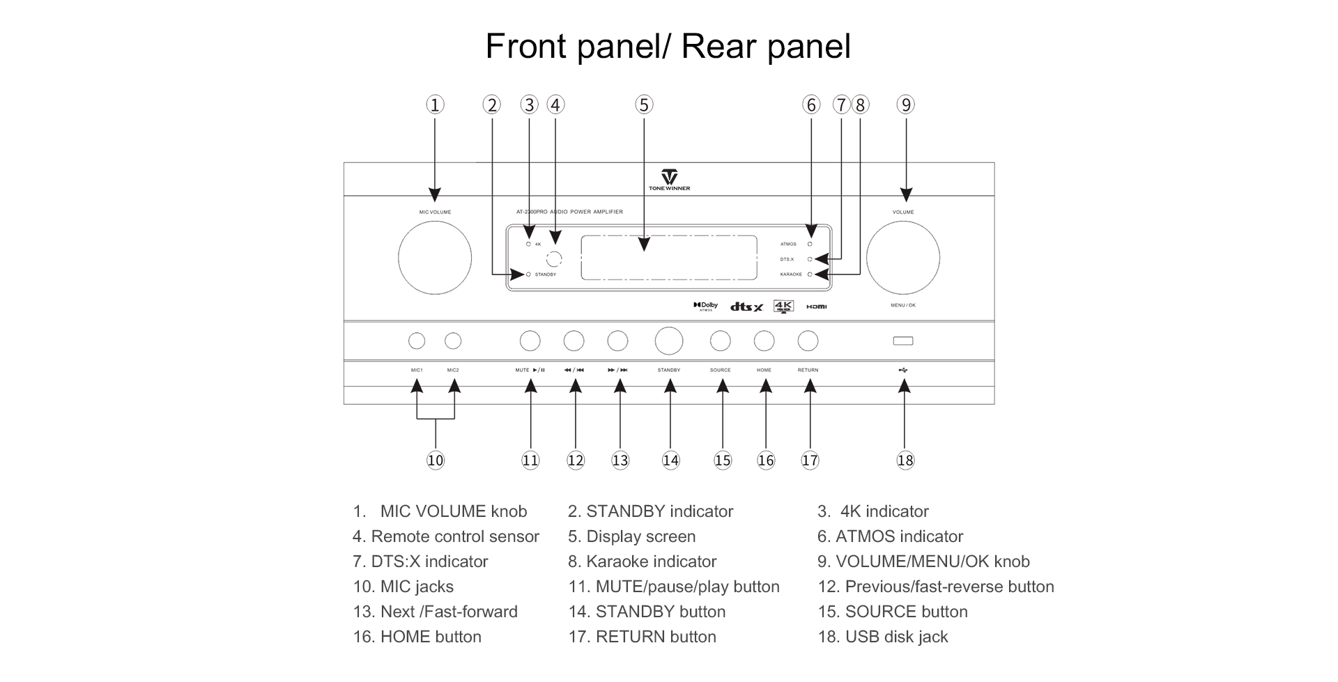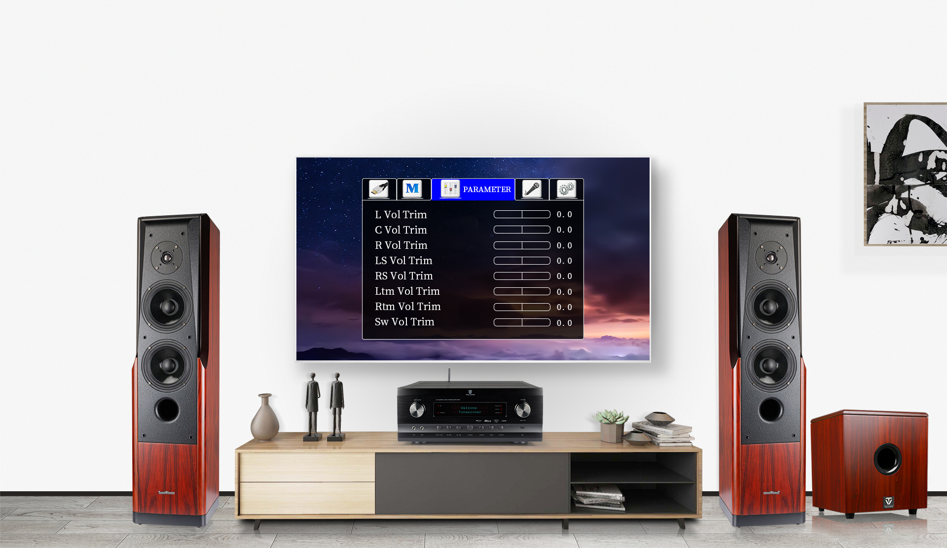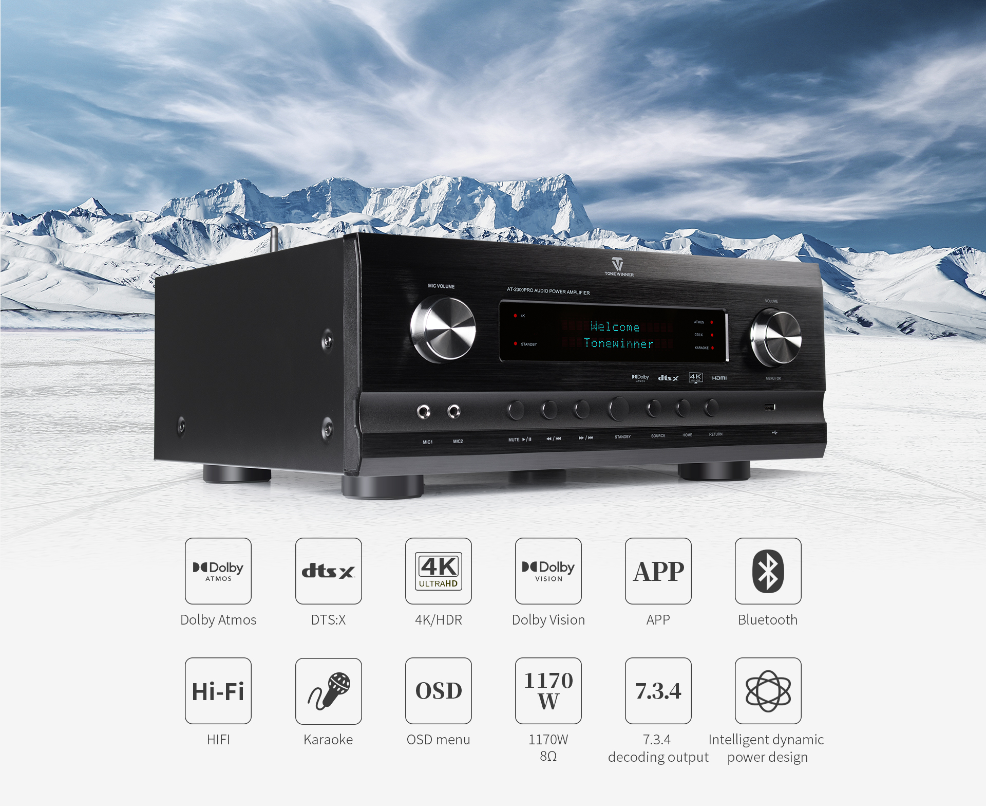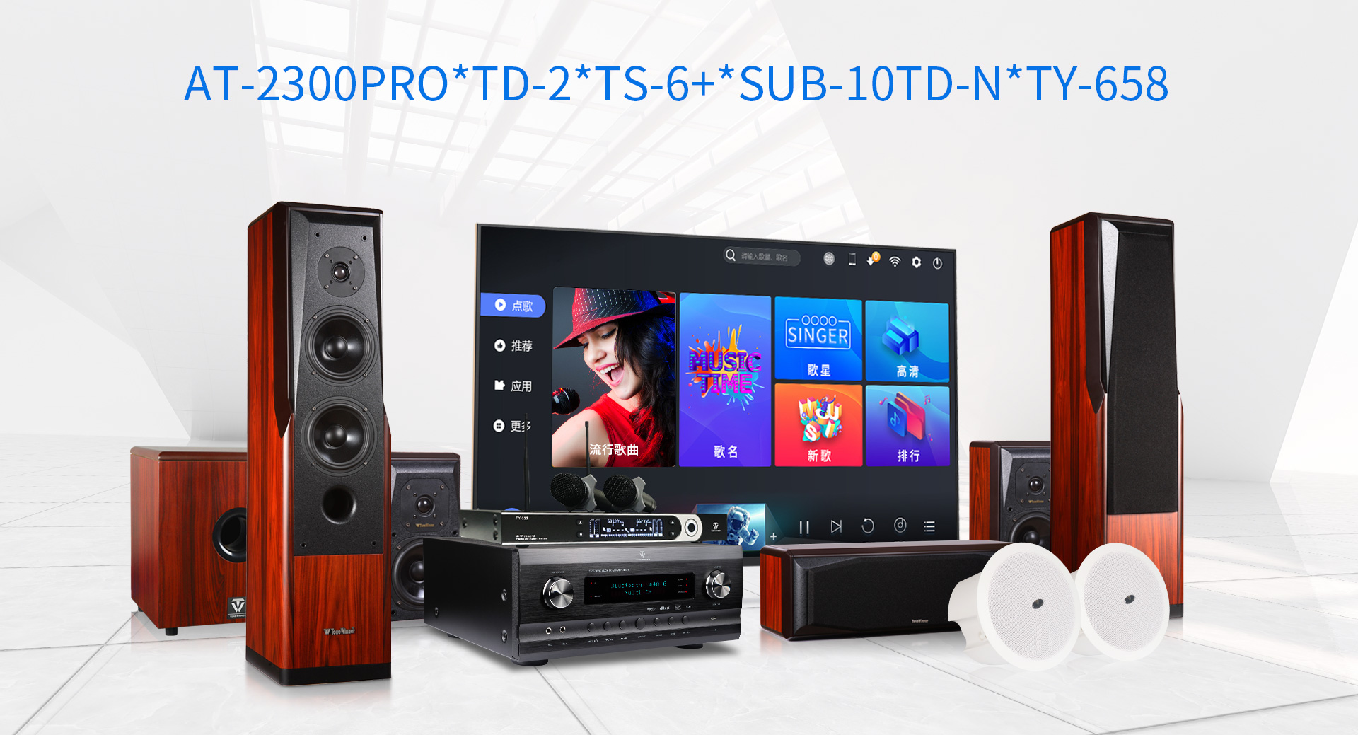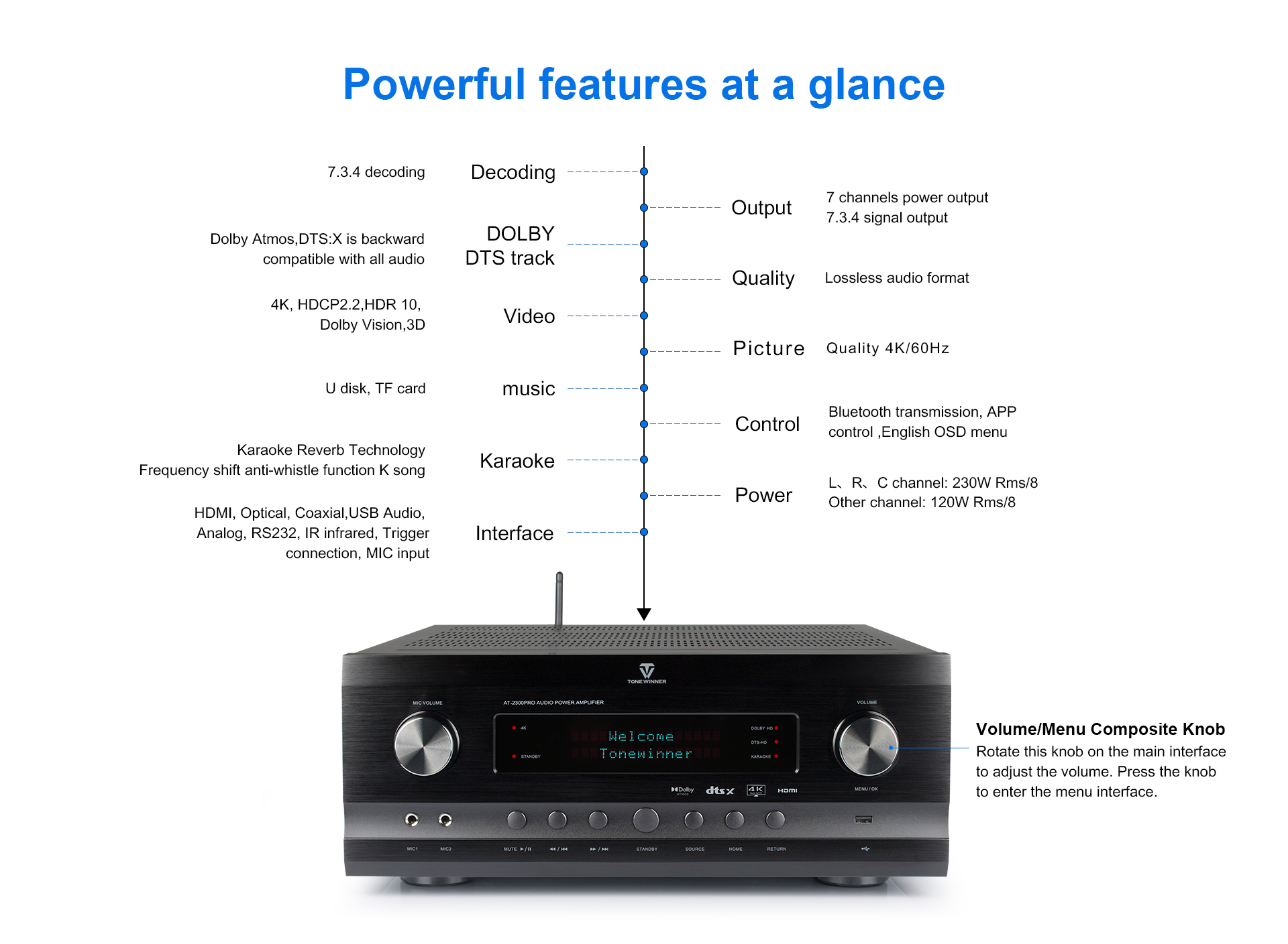 جهاز AT-2300PRO هو مضخم صوت متكامل لمسرح دولبي أتموس وكاريوكي. إنه جهاز متكامل يجمع بين نظام المسرح المنزلي ومركز الموسيقى الشخصي ونظام الكاريوكي الاحترافي. يُعد نظام الكاريوكي الاحترافي AT-2300PRO، المزود بتقنية الغمر بـ 5.1.2 قناة، رائدًا في صناعة الصوت. يدعم قناة إرجاع الصوت (ARC)، مما يُمكّن التلفزيون الذكي من تحويله إلى جهاز ترتيب أغاني.