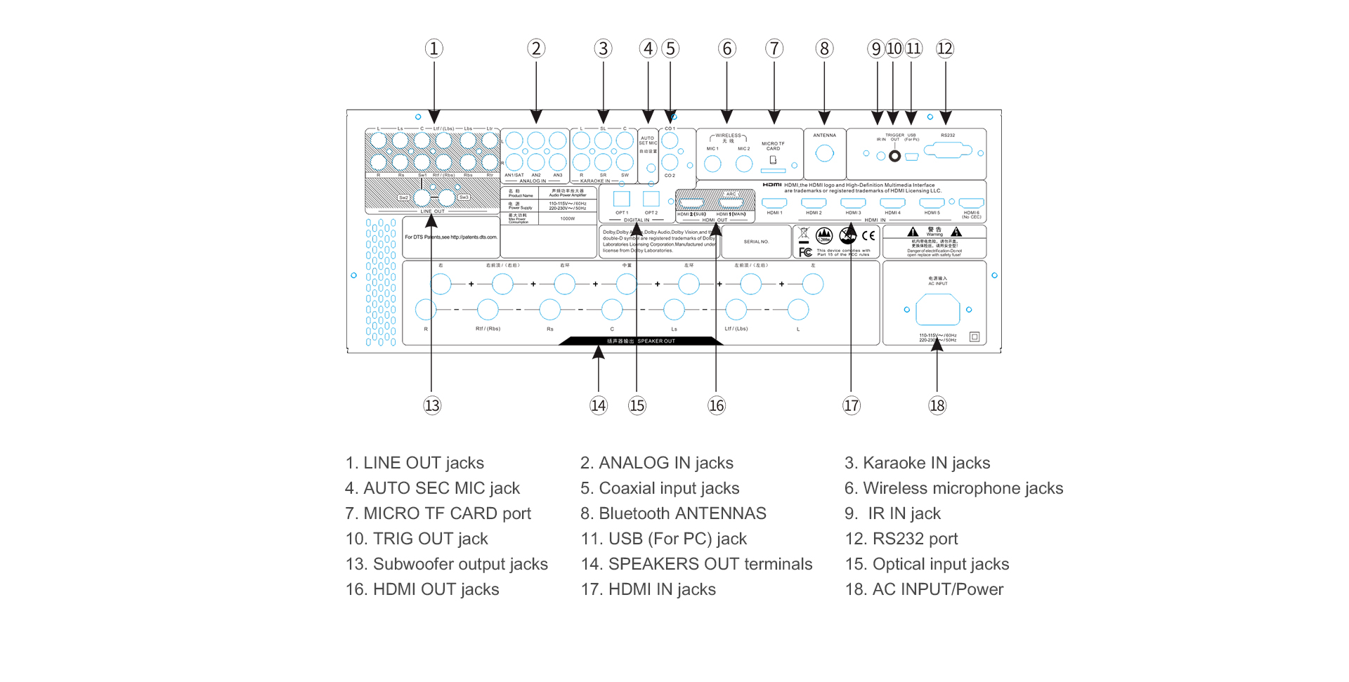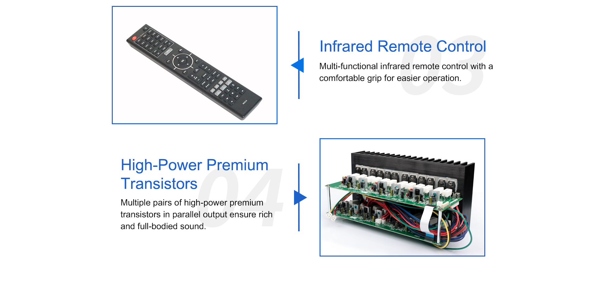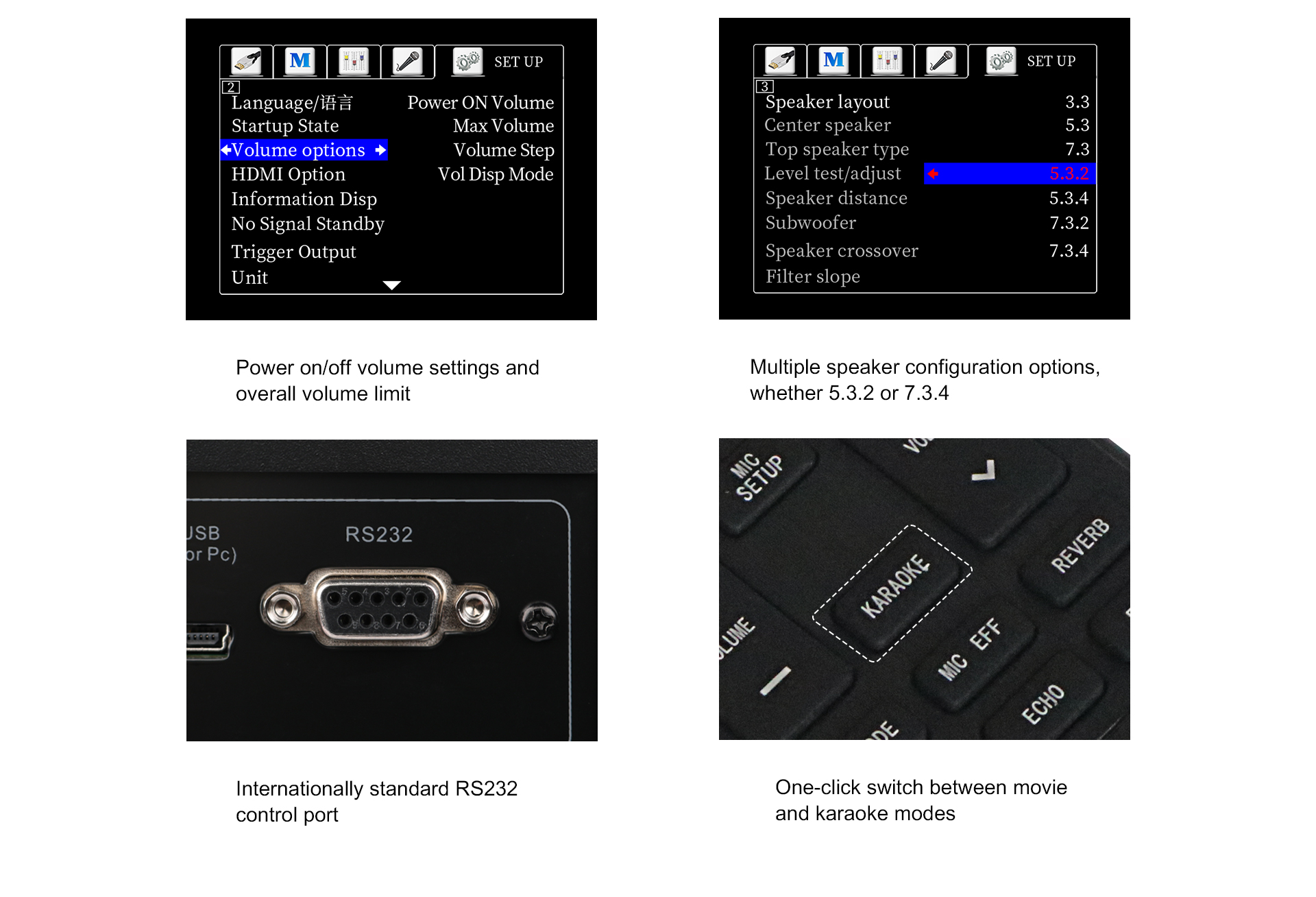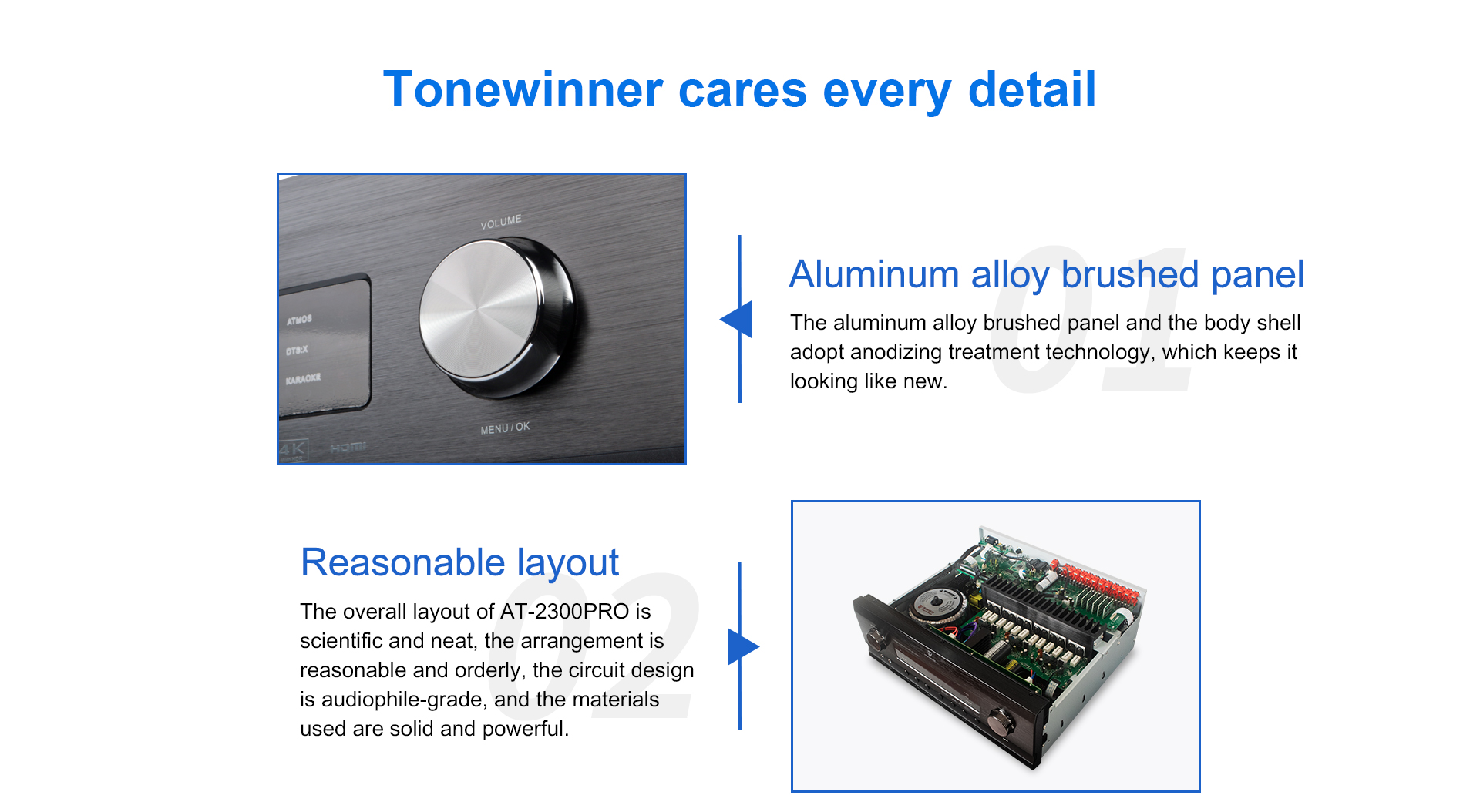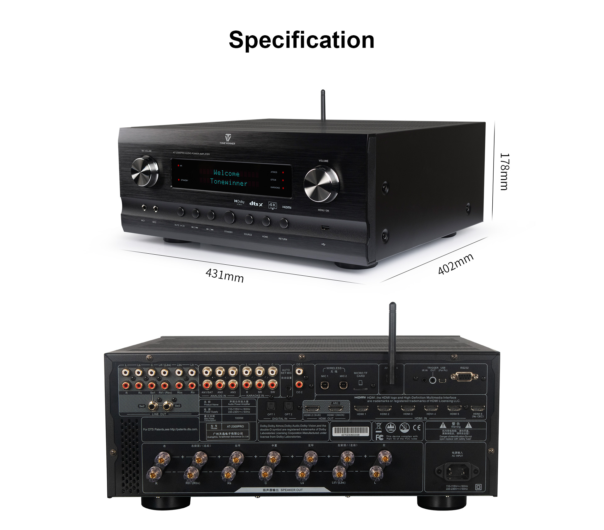 جهاز AT-2300PRO هو مضخم صوت متكامل لمسرح دولبي أتموس وكاريوكي. إنه جهاز متكامل يجمع بين نظام المسرح المنزلي ومركز الموسيقى الشخصي ونظام الكاريوكي الاحترافي. يُعد نظام الكاريوكي الاحترافي AT-2300PRO، المزود بتقنية الغمر بـ 5.1.2 قناة، رائدًا في صناعة الصوت. يدعم قناة إرجاع الصوت (ARC)، مما يُمكّن التلفزيون الذكي من تحويله إلى جهاز ترتيب أغاني.