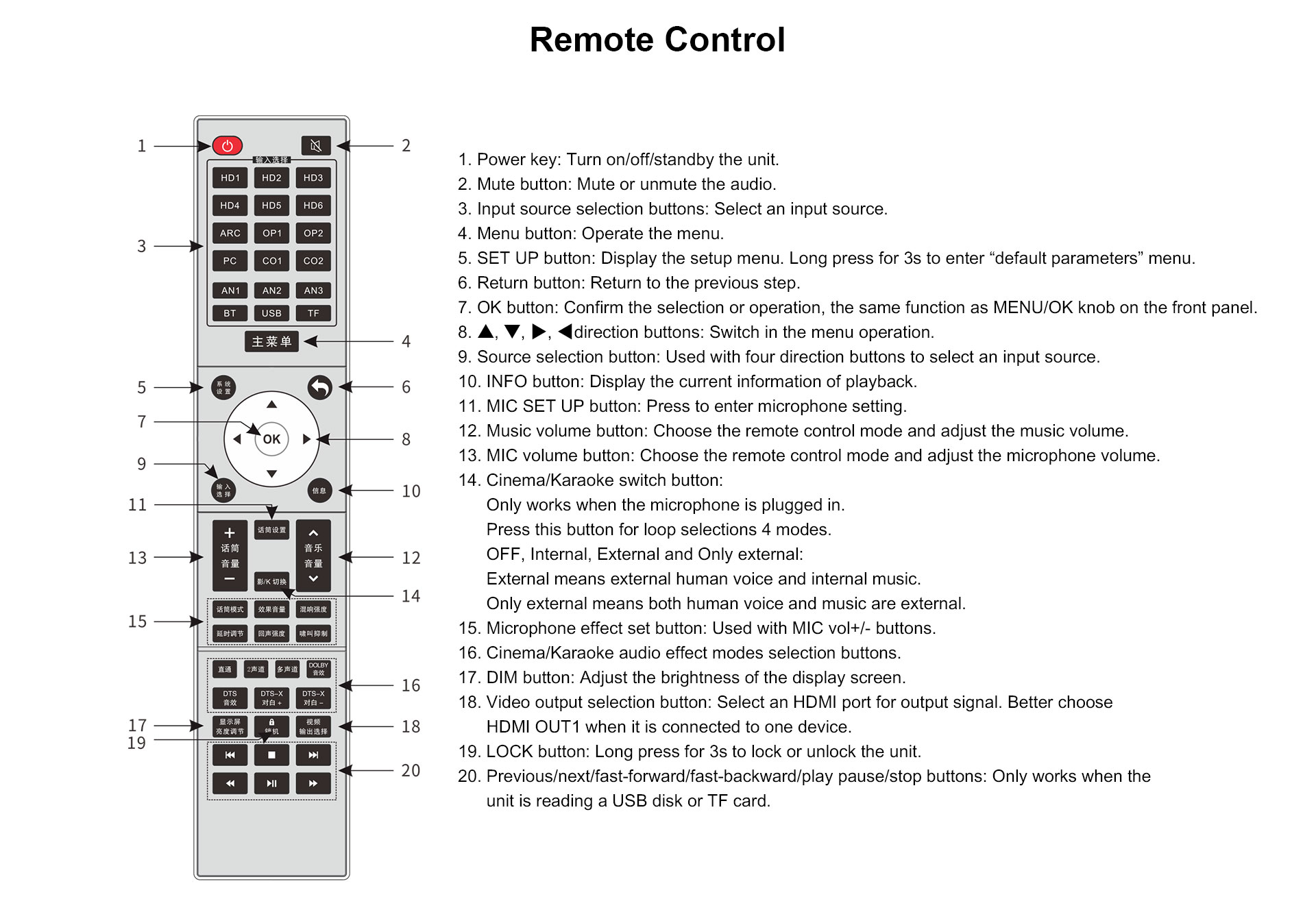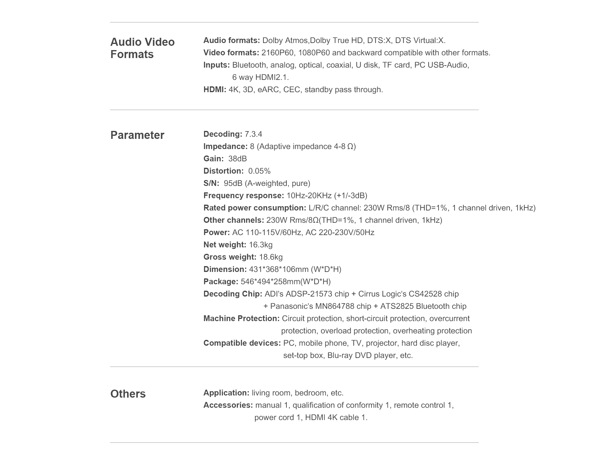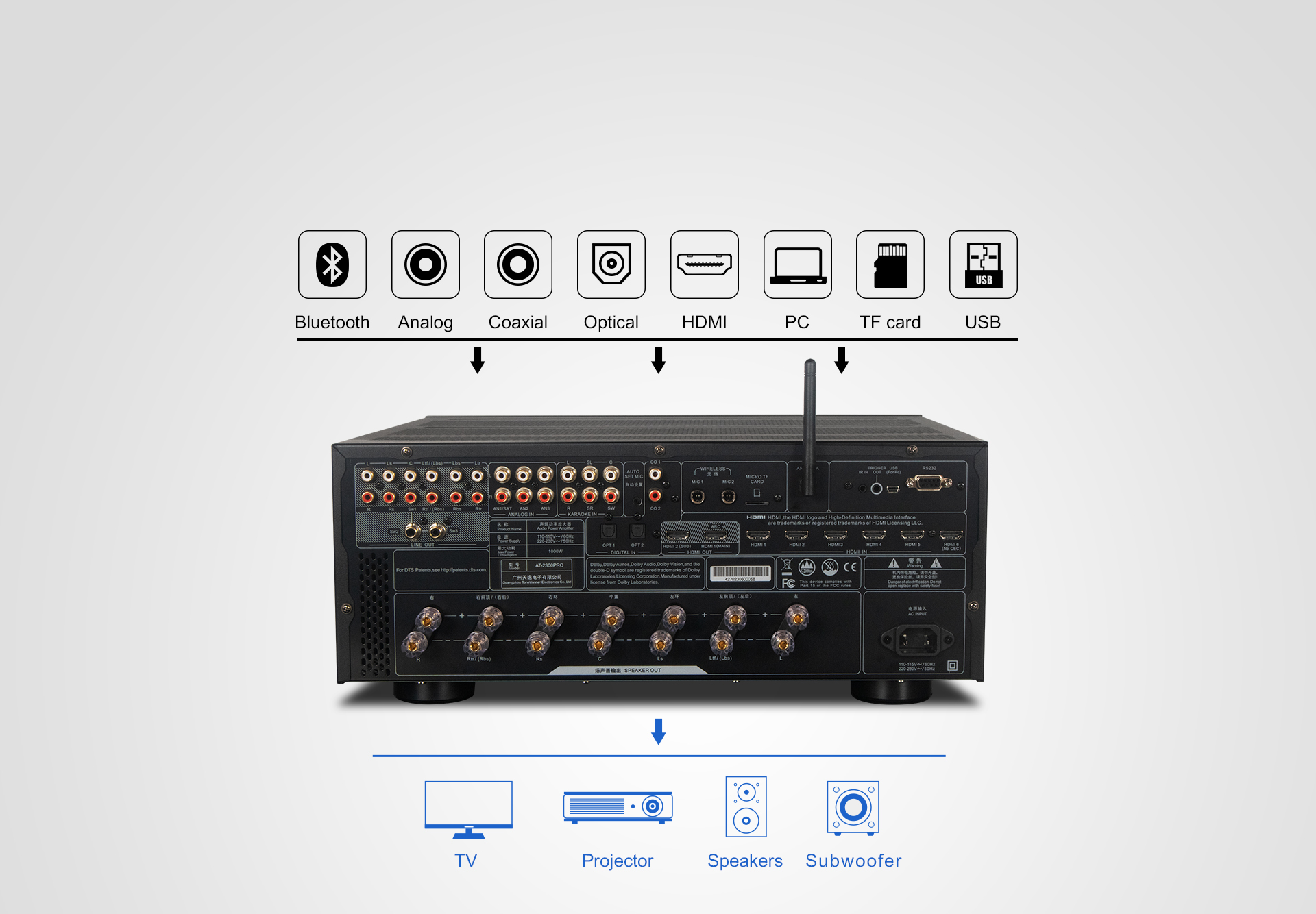 يدعم HDMl 6 في 2 خارج، ARc، المدخلات البصرية/المحورية، مدخلات الصوت U disk/TF card/Pc، Bluetooth،