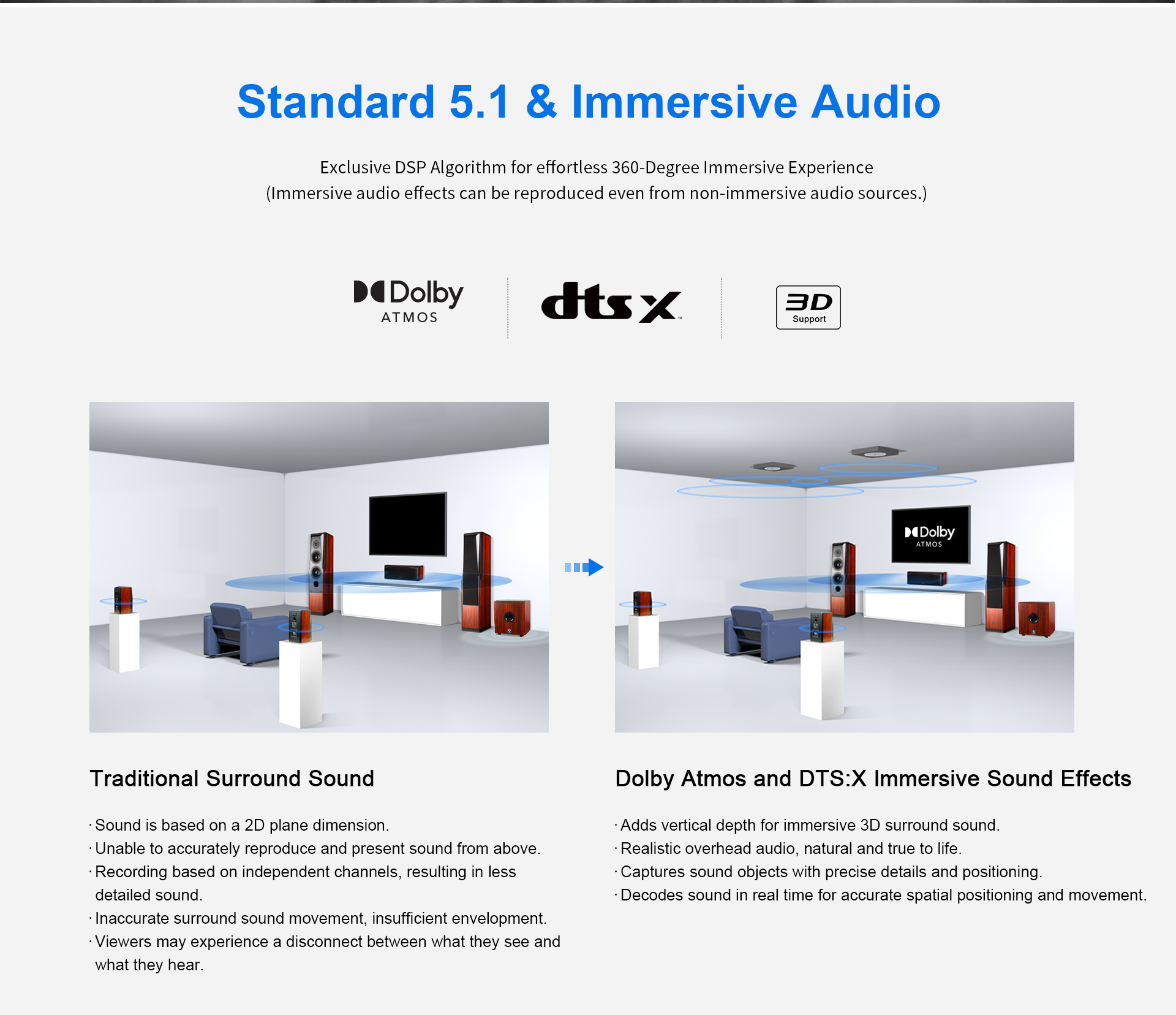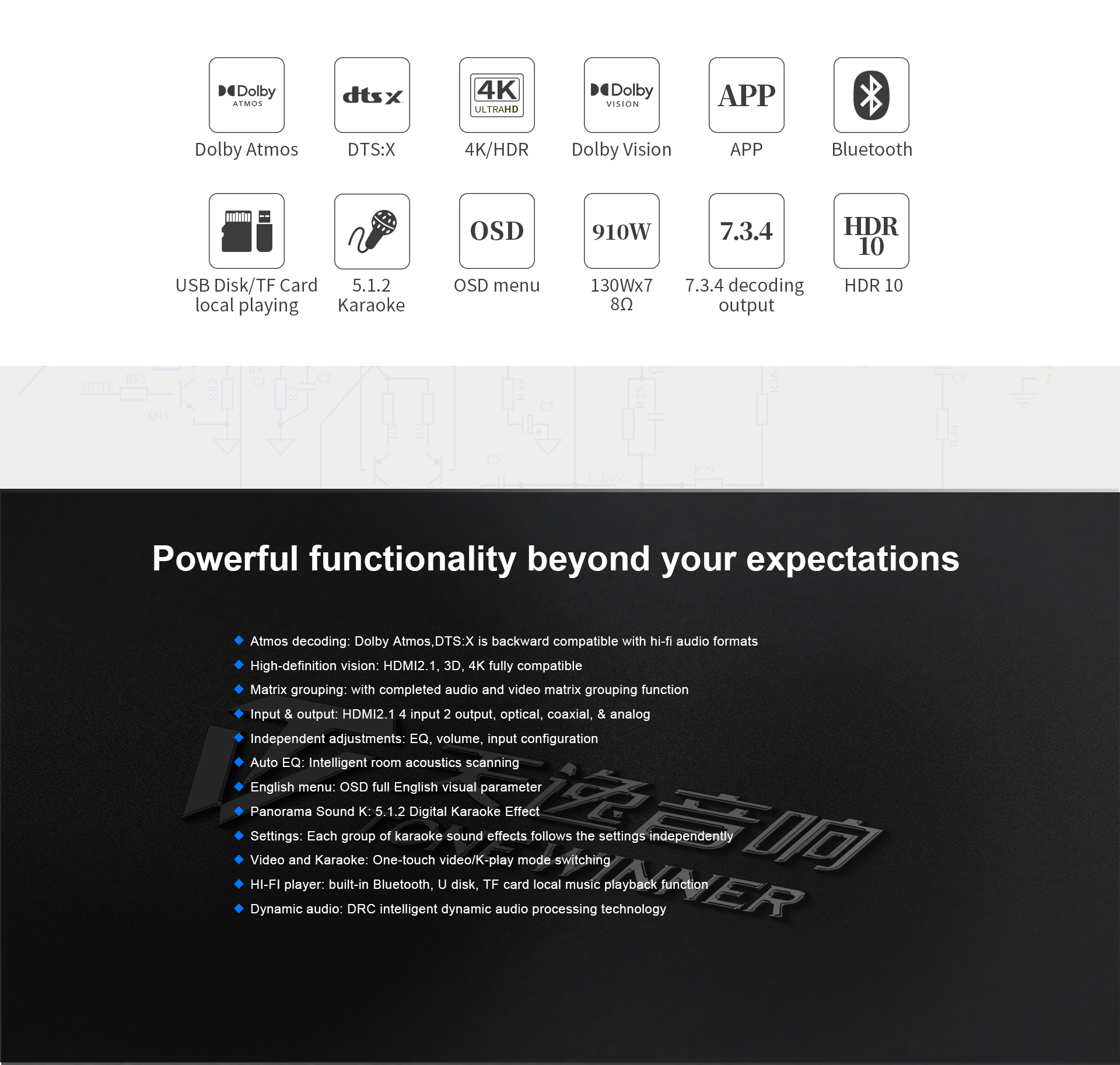 تشكل المكونات المتكاملة المختارة بعناية ولوحات الدوائر المطلية بالذهب متعددة الطبقات أساسًا قويًا لتقديم تأثيرات صوتية بجودة سينمائية.