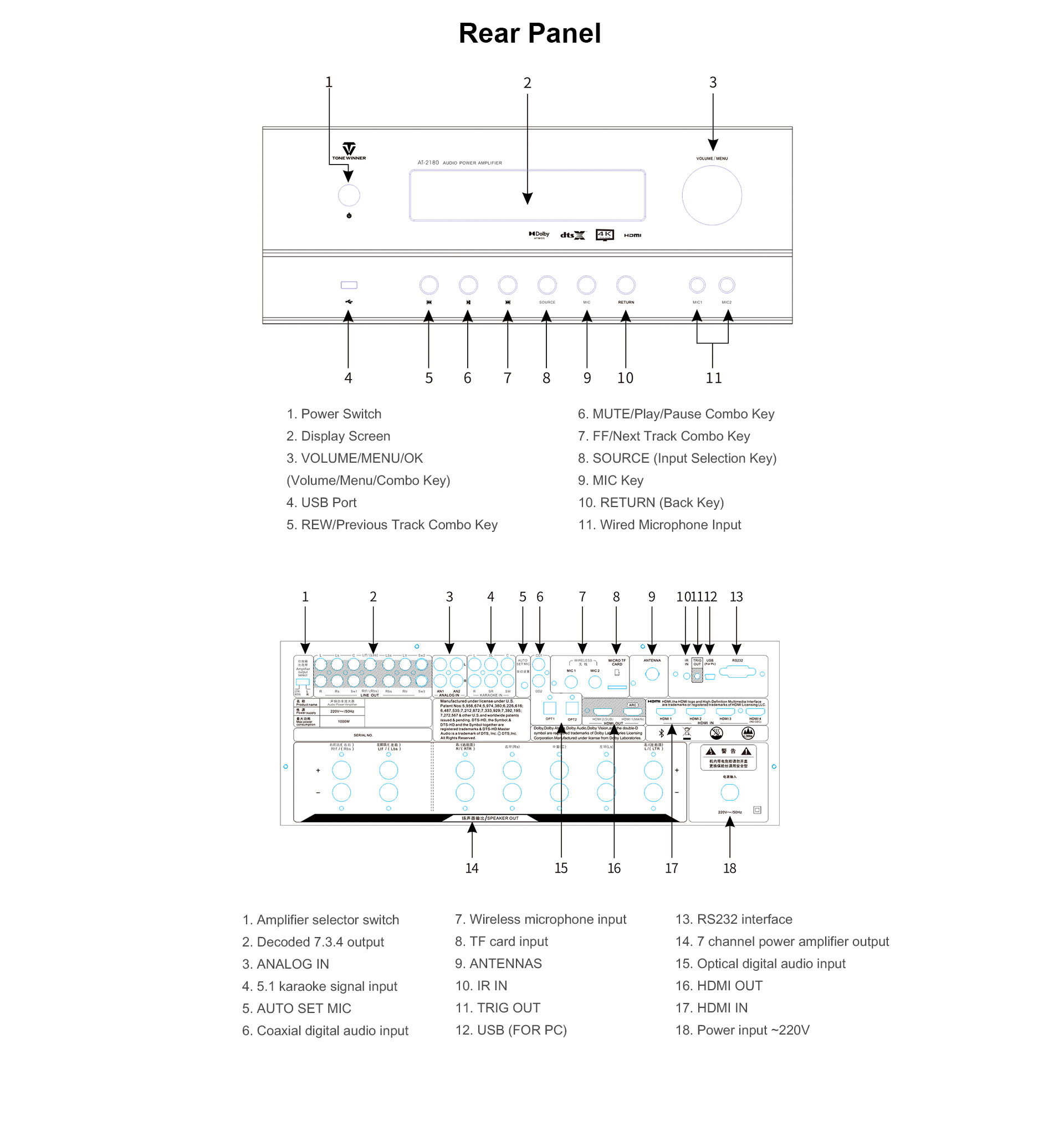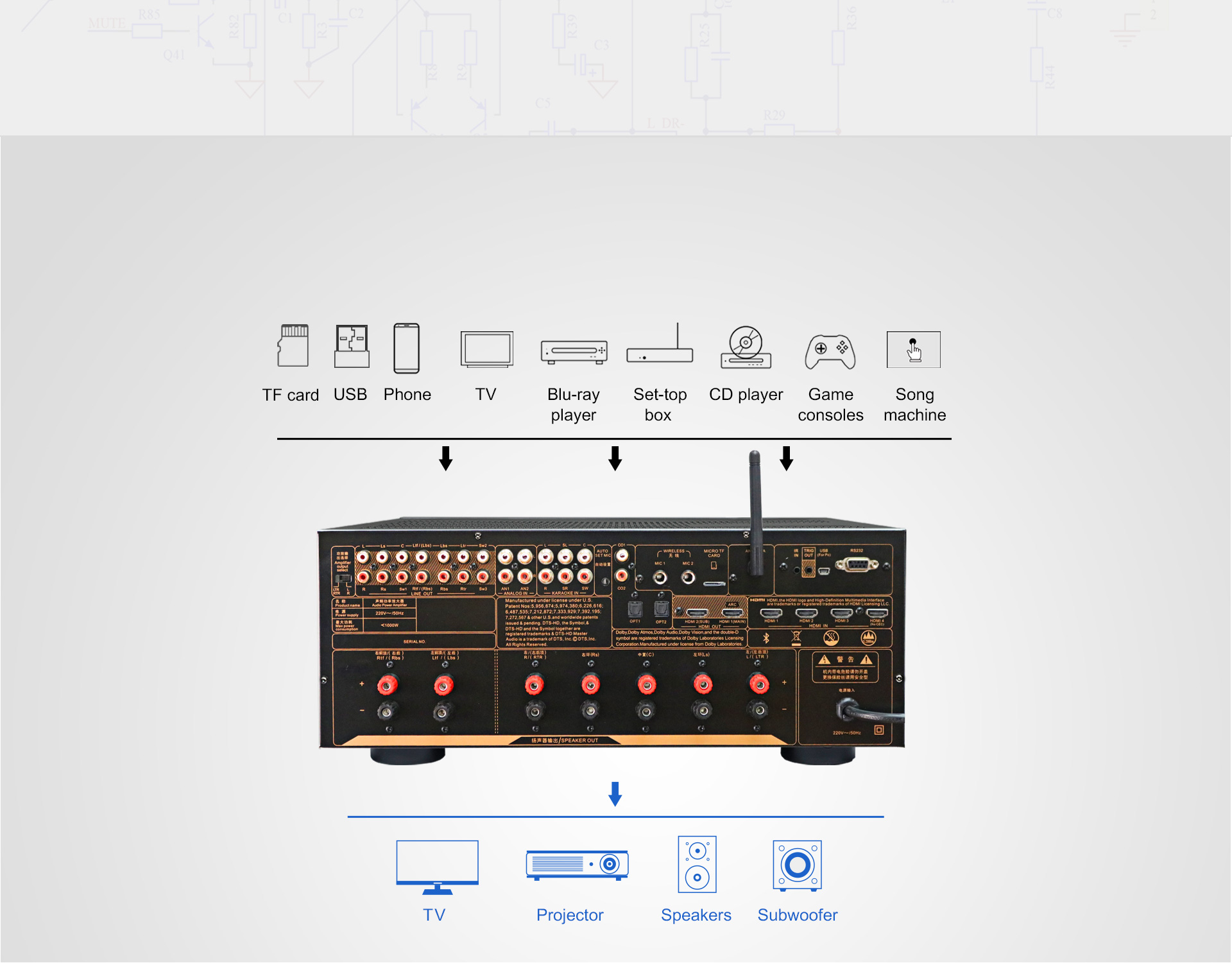 يدعم HDMI 4 في 2 مخرج، ARC، والمدخلات الرقمية البصرية/المحورية، ومدخلات الصوت لمحرك USB/بطاقة TF/الكمبيوتر، ونقل بلوتوث بدون فقدان، ومخرج تشغيل 5 فولت، ومدخل الأشعة تحت الحمراء، ومنفذ التحكم القياسي RS232.