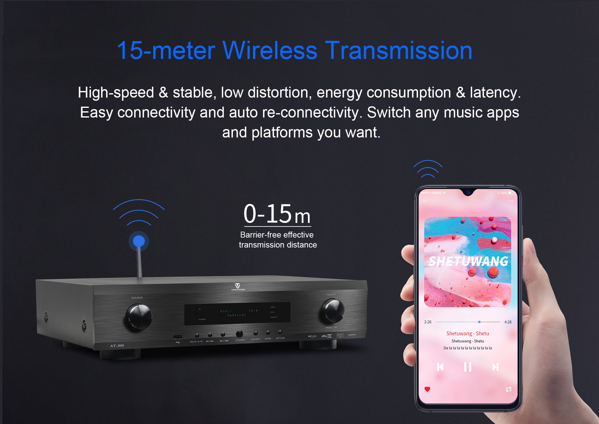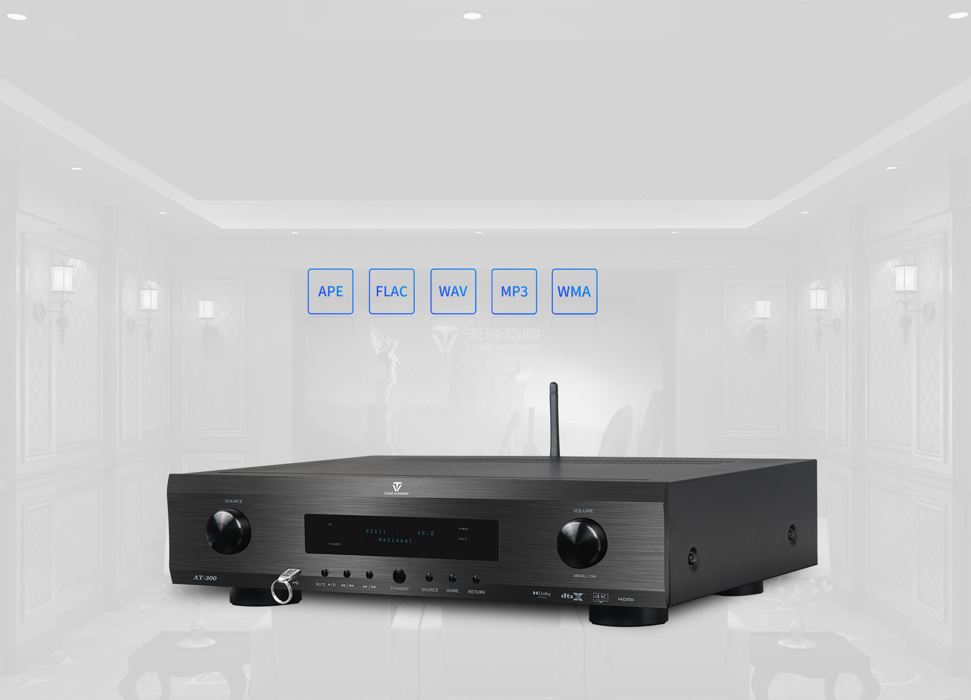 جهاز AT-300 هو جهاز فك تشفير صوتي-مرئي احترافي متكامل لأنظمة المسرح المنزلي ومراكز الموسيقى، مصمم لأنظمة 9.3.4. تتمتع شركة dTonewinner بخبرة تزيد عن 30 عامًا في تصميم وتصنيع هذا الجهاز، وقد صممه مهندسون معتمدون من شركة THX الأمريكية. يدعم الجهاز فك تشفير 4K، وهو حاصل على شهادات Dolby Atmos وDTS:X وHDMI 2.0.