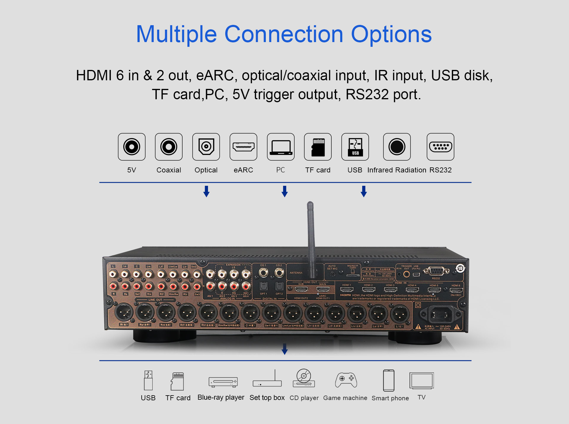 AT-300 هو 16 قناة فك تشفير AV للمسرح المنزلي . هذا معالج احترافي يدعم دقة 4K وهو معتمد من Dolby Atmos وDTS:X وHDMI 2.0. جهاز فك تشفير متعدد الوظائف يمكن استخدام هذا المضخم المسبق في المنازل ودور السينما والمسارح للحصول على تأثير صوتي ثلاثي الأبعاد عالي الدقة غامر.