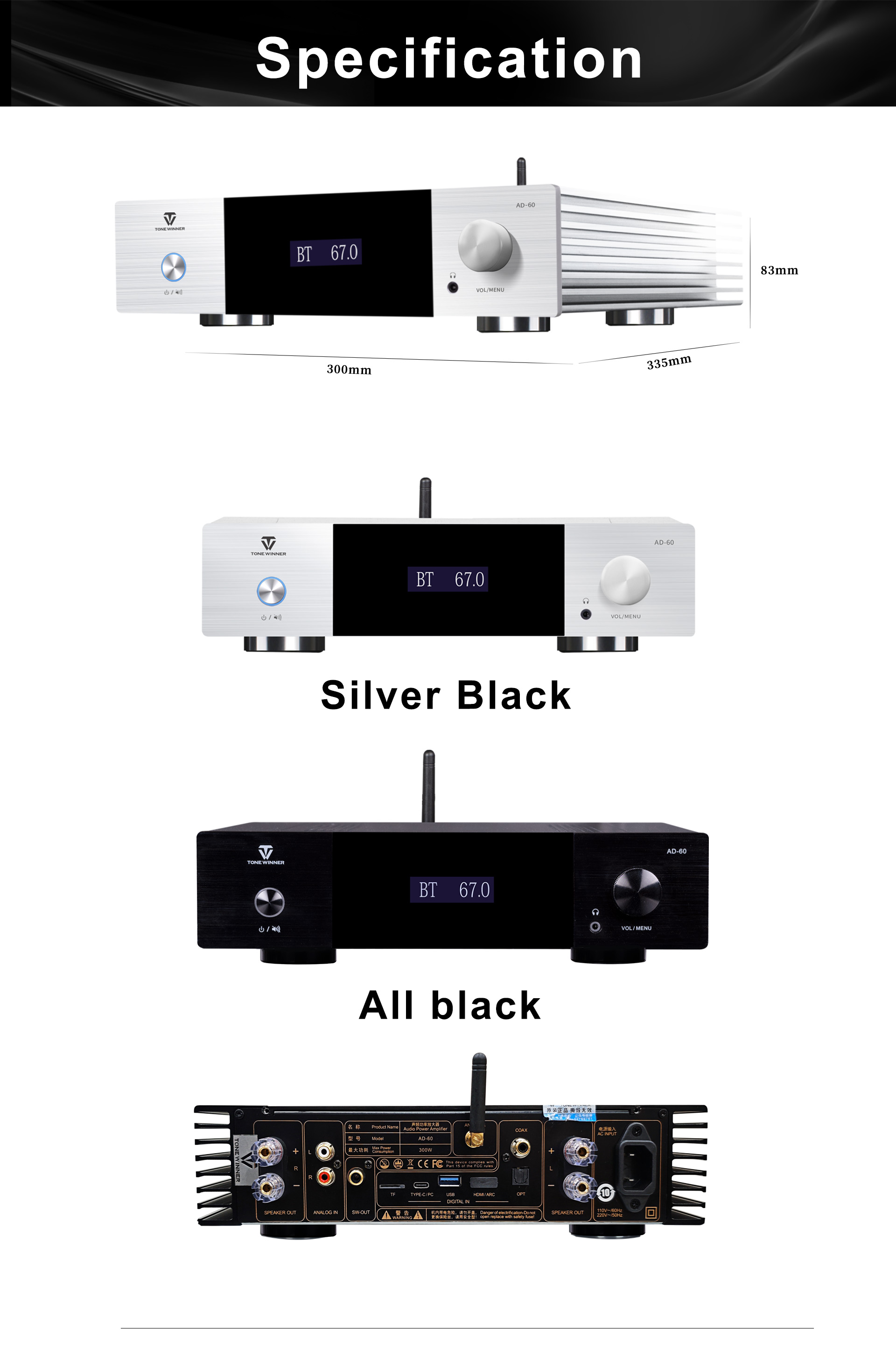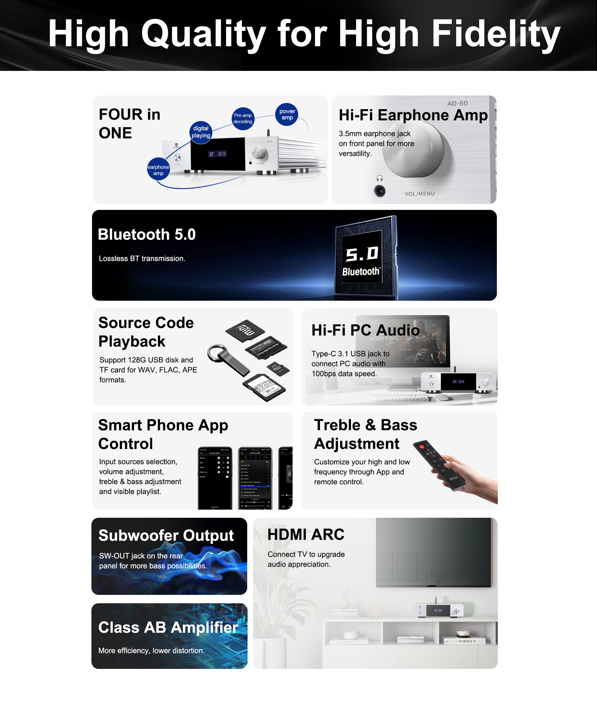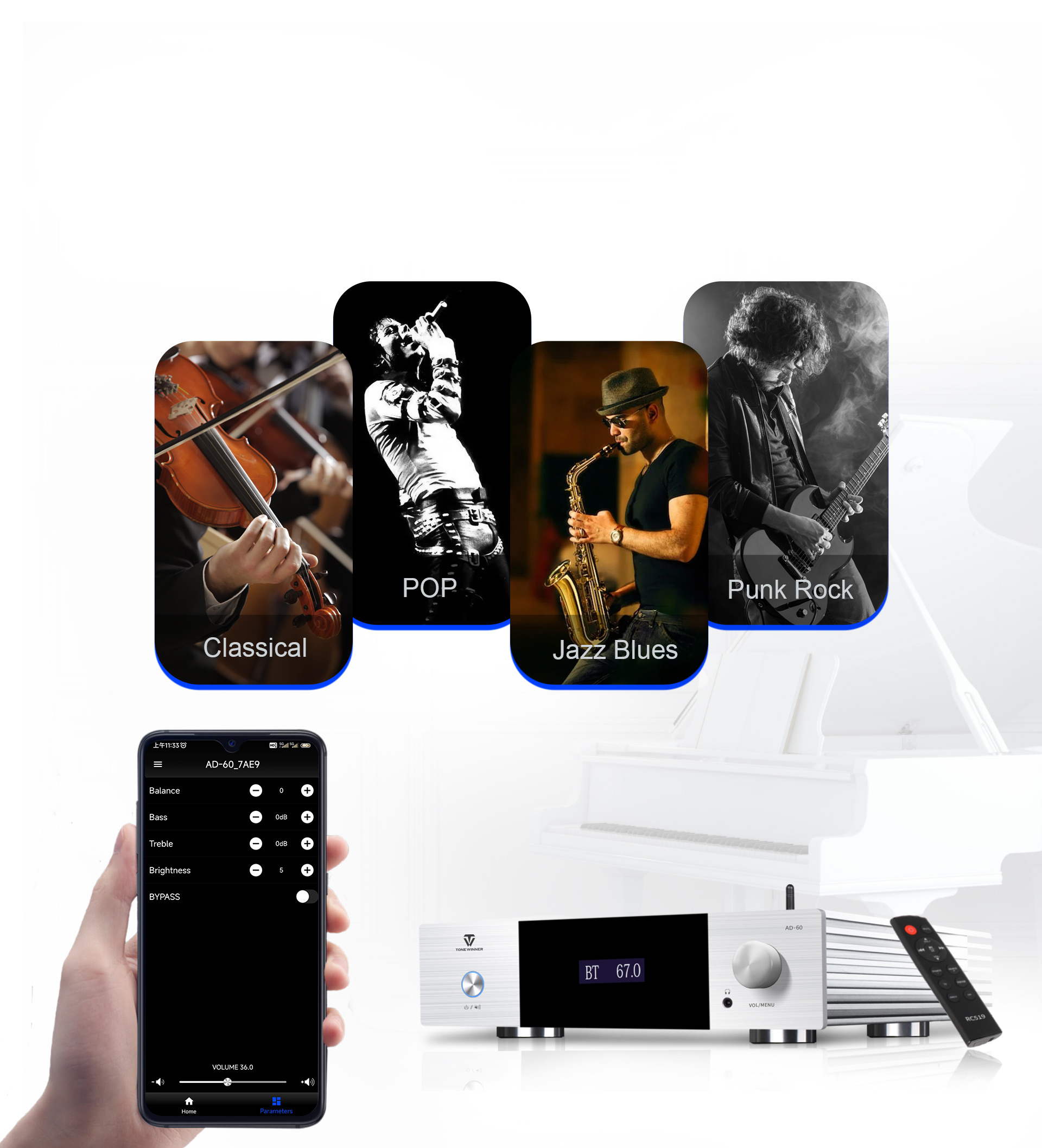 AD-60 هو مضخم صوت مدمج من الفئة AB يدعم نظام 2.1. يجمع بين فك تشفير المضخم المسبق، ومضخم الصوت، والتشغيل الرقمي، ومضخم صوت سماعة الأذن، ليدعم تقنية بلوتوث 5.0، وذاكرة USB، وبطاقة TF، والتحكم بتطبيقات الهواتف الذكية، والمدخلات الرقمية، بما في ذلك المدخلات البصرية والمحورية ومدخلات USB الصوتية للكمبيوتر الشخصي. صُمم وصُنع في الأصل من مواد ومكونات عالية الجودة لتقديم صوت تحليلي. إنه مضخم صوت عصري واقتصادي لتجربة صوتية عالية الدقة.