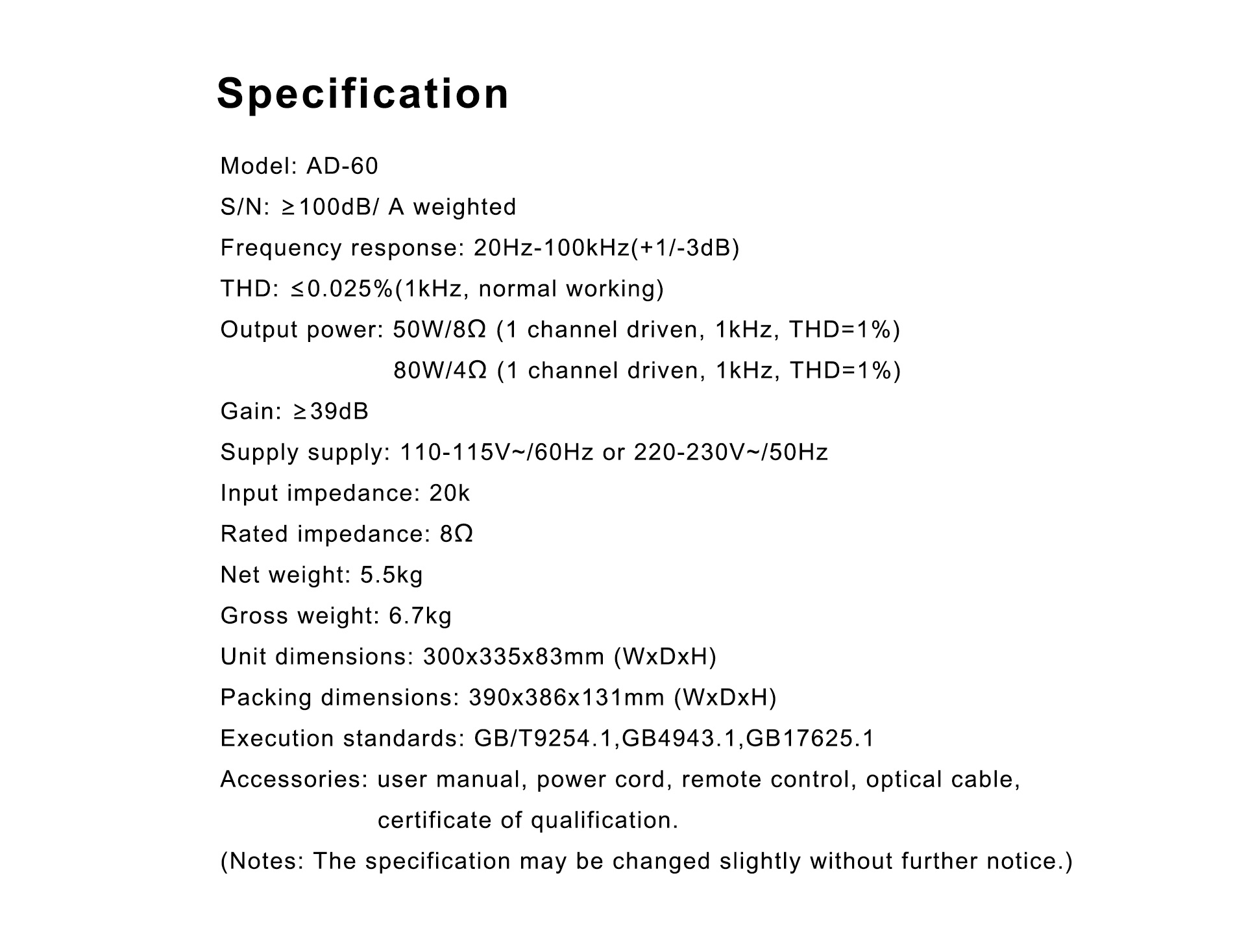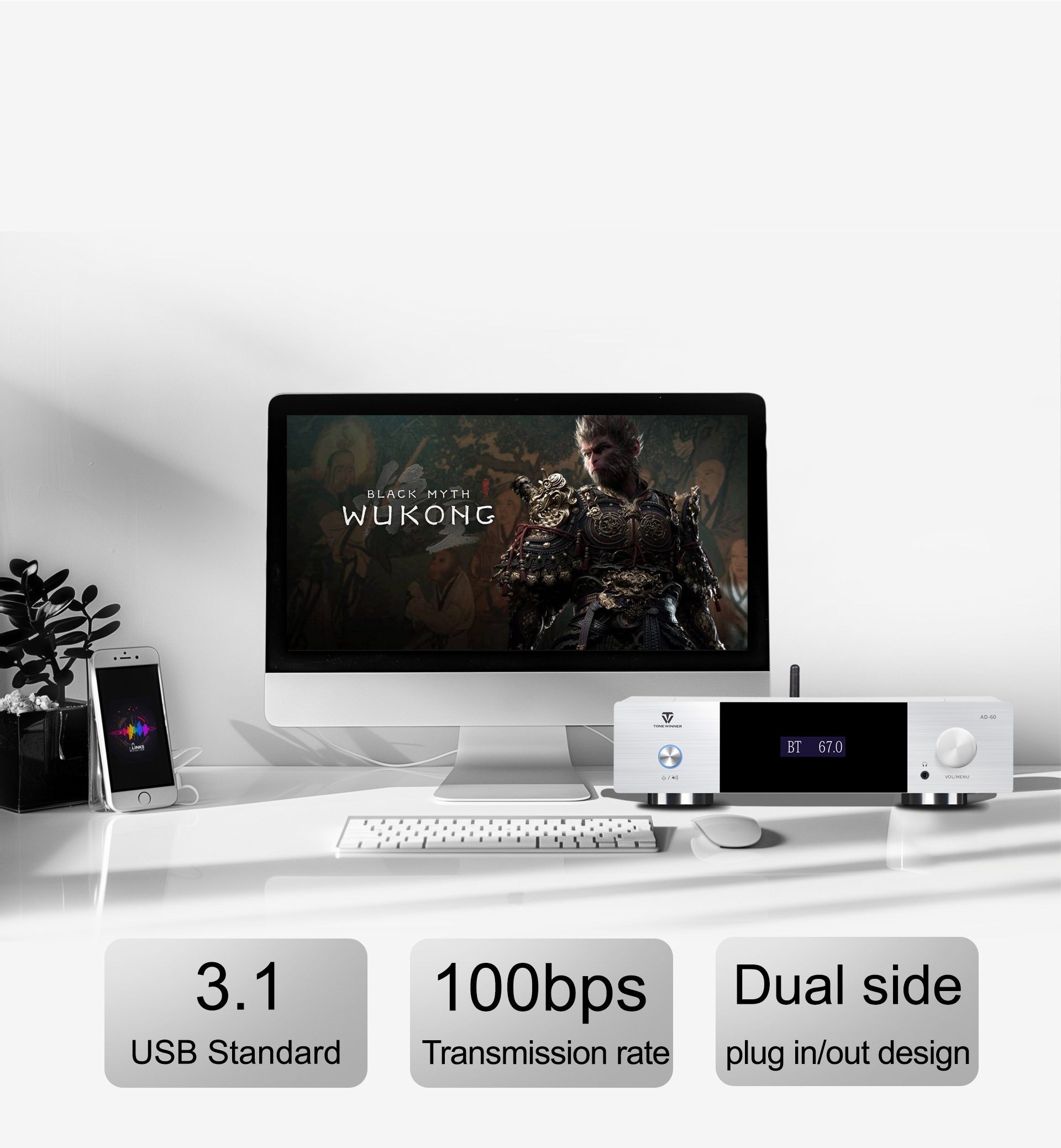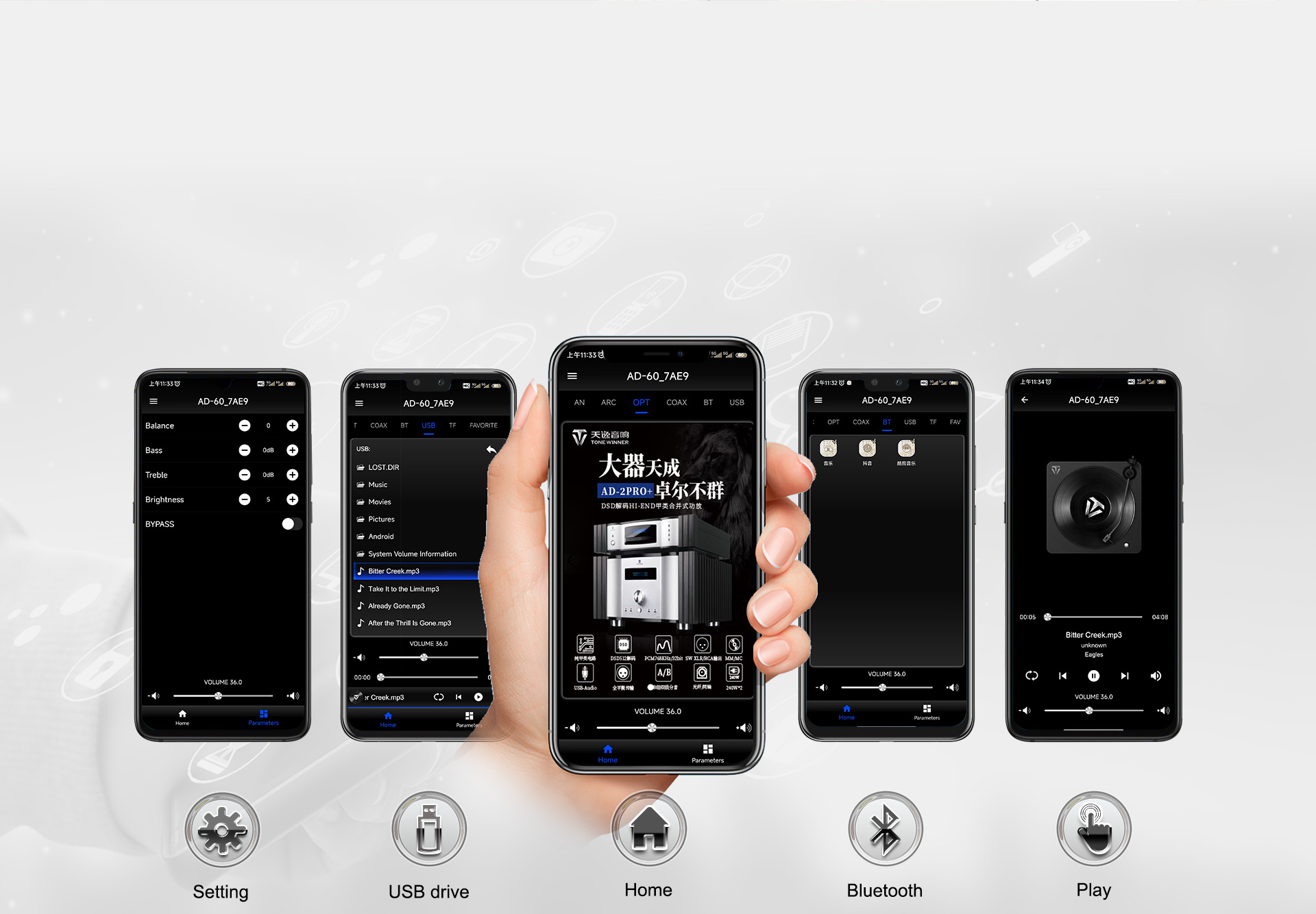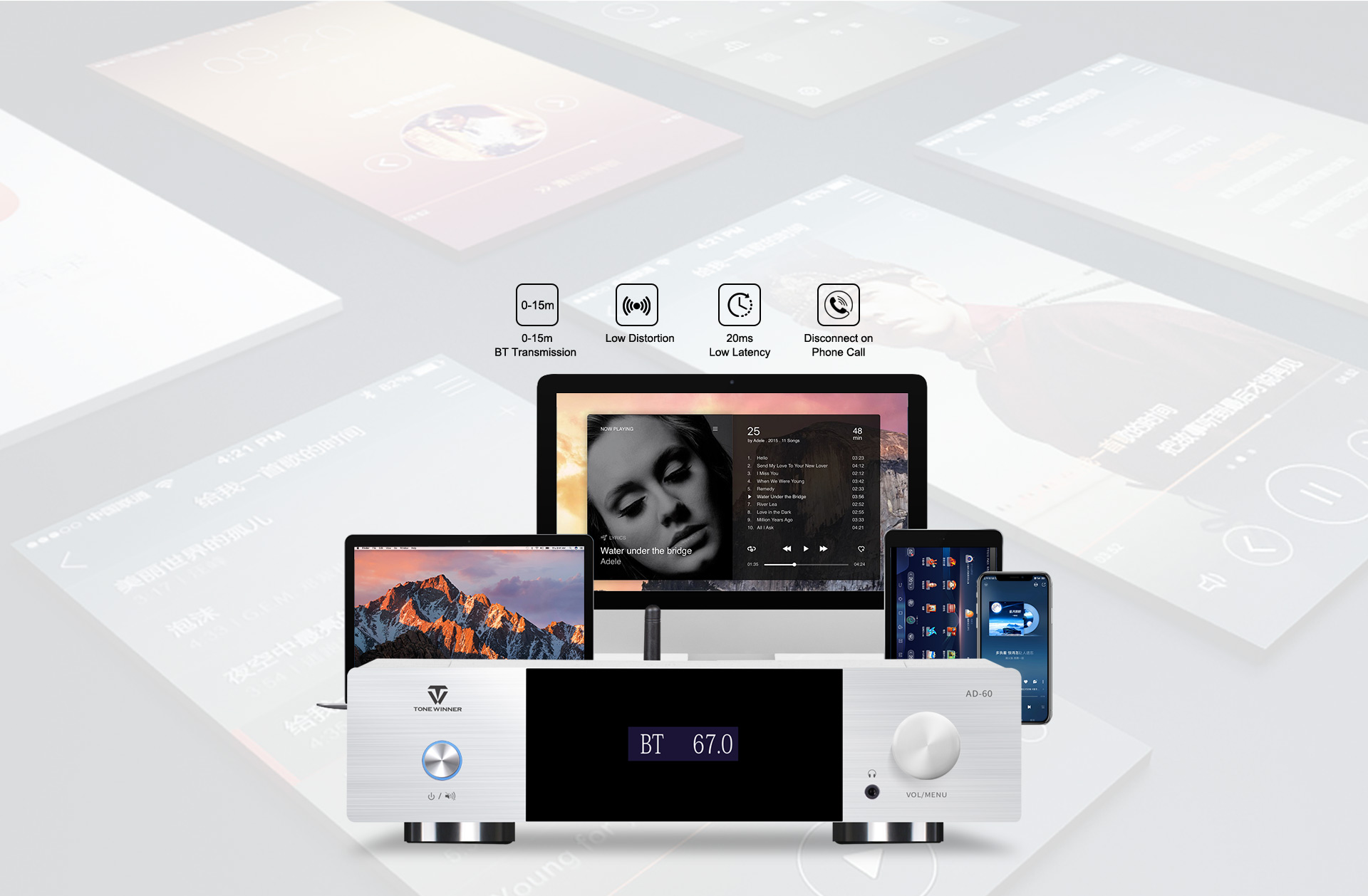 AD-60 هو مضخم صوت مدمج من الفئة AB يدعم نظام 2.1. يجمع بين فك تشفير المضخم المسبق، ومضخم الصوت، والتشغيل الرقمي، ومضخم صوت سماعة الأذن، ليدعم تقنية بلوتوث 5.0، وذاكرة USB، وبطاقة TF، والتحكم بتطبيقات الهواتف الذكية، والمدخلات الرقمية، بما في ذلك المدخلات البصرية والمحورية ومدخلات USB الصوتية للكمبيوتر الشخصي. صُمم وصُنع في الأصل من مواد ومكونات عالية الجودة لتقديم صوت تحليلي. إنه مضخم صوت عصري واقتصادي لتجربة صوتية عالية الدقة.