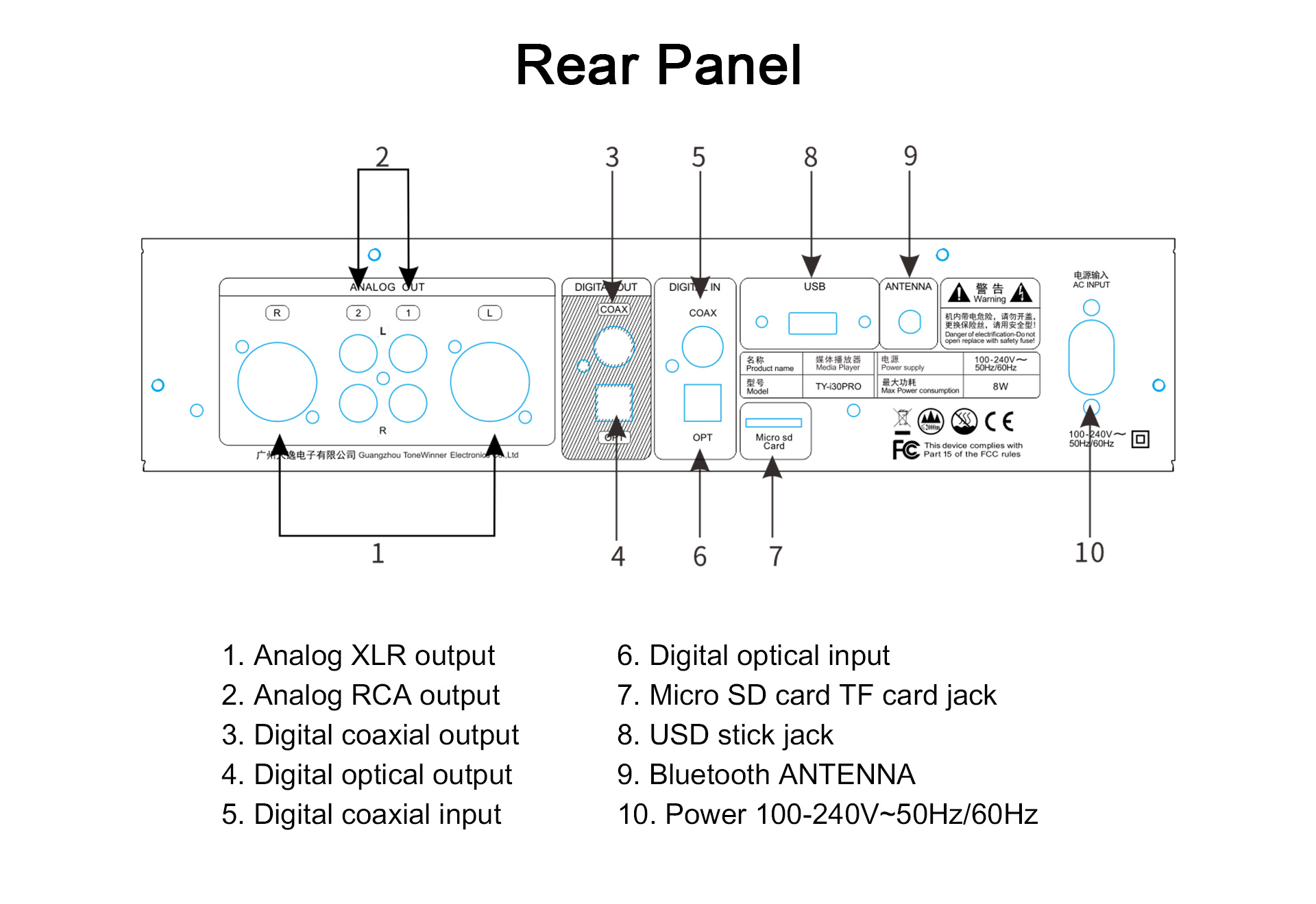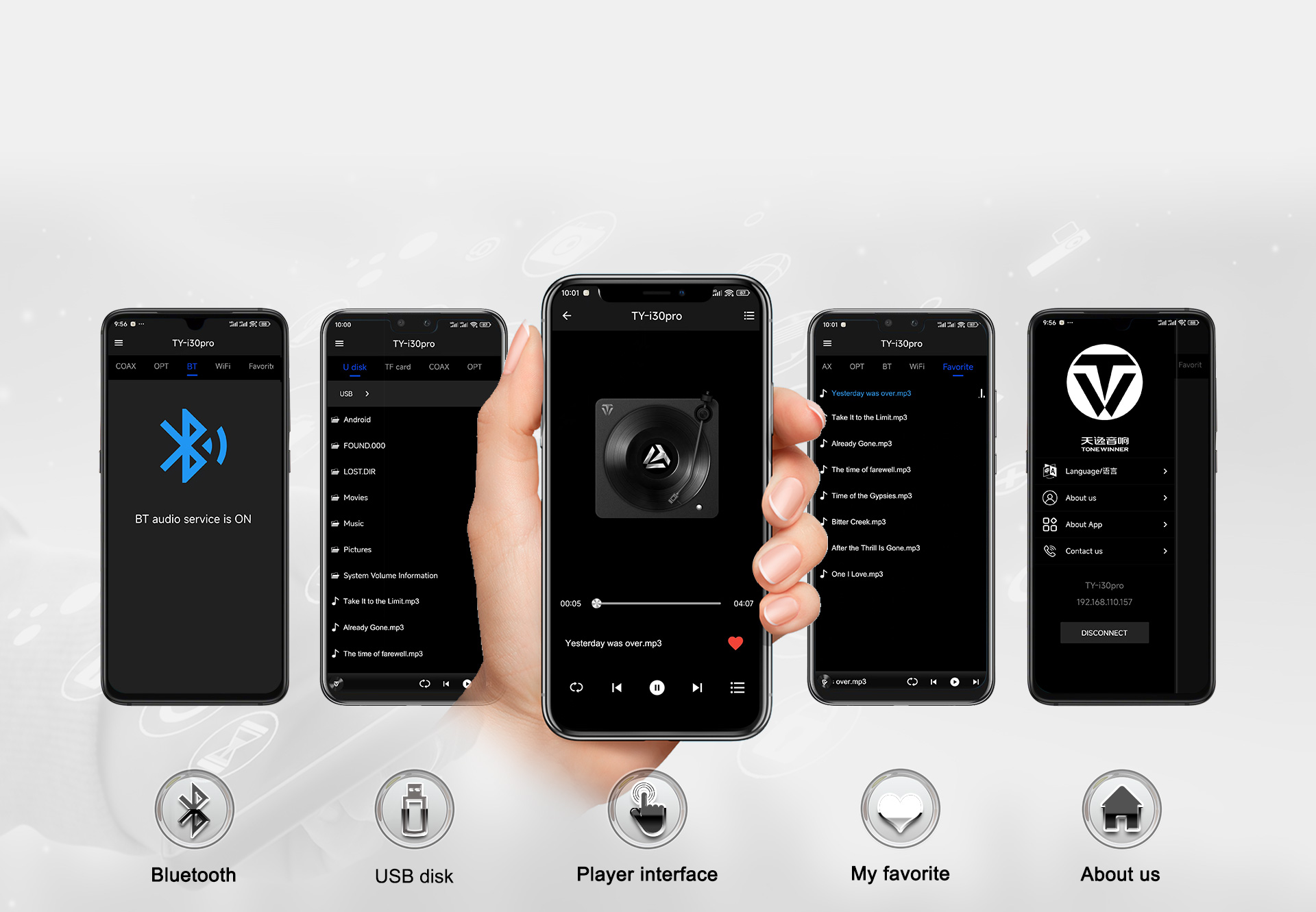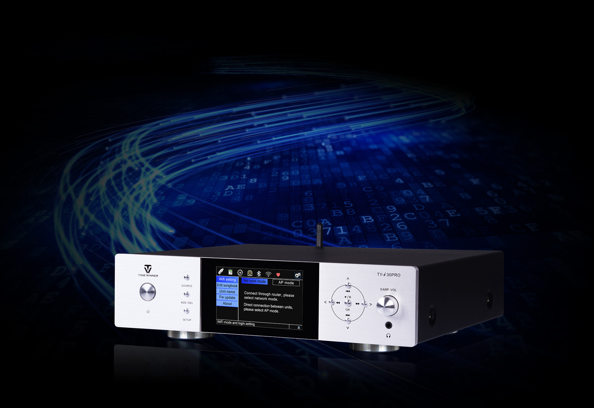 TY-i30PRO هو مشغل وسائط جديد متعدد الوظائف أطلقته ToneWinner. يستقبل هذا المشغل الأغاني من الهواتف المحمولة وأجهزة iPad وأجهزة الكمبيوتر المحمولة وغيرها من الأجهزة عبر تقنيات DLNA وAIRPLAY وBluetooth. يدعم TY-i30PRO التشغيل المحلي للأقراص الصلبة المحمولة بسعة 2 تيرابايت وبطاقات TF ومحركات أقراص USB المحمولة، ويدعم صيغ الموسيقى بدون فقدان للبيانات مثل WAV/FLAC وAPE، ويحتوي على مقبس سماعة رأس أمامي مقاس 3.5 مم، ويدعم إدخال وإخراج تنسيق البث الرقمي PCM البصري والمحوري 192 كيلو هرتز/24 بت.