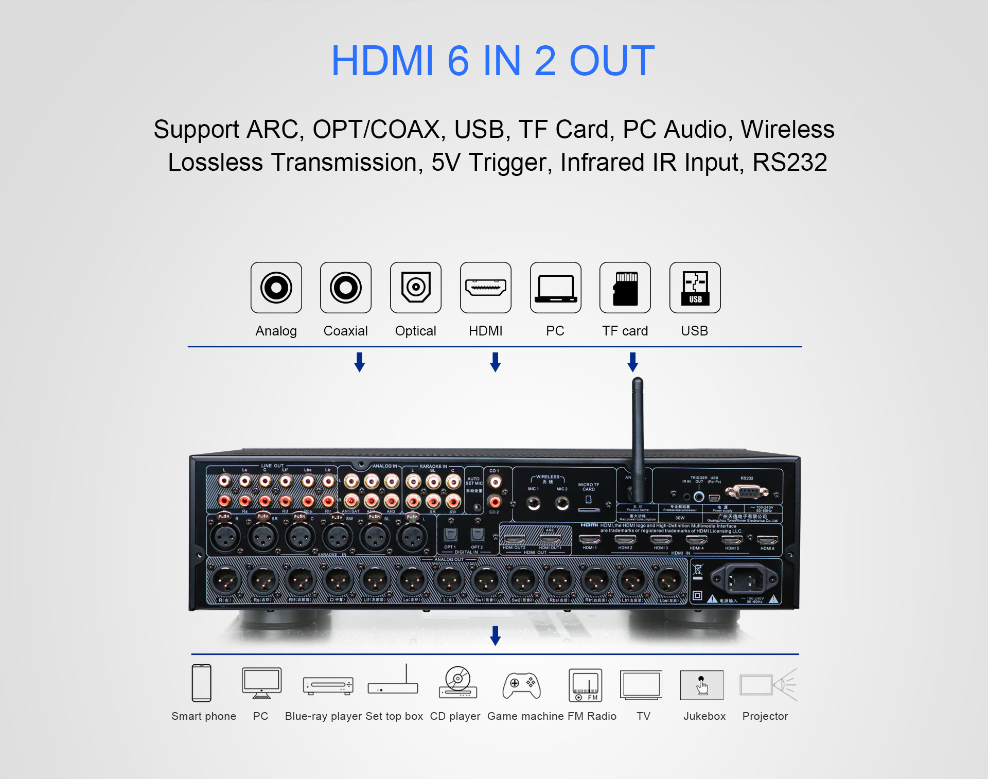 جهاز AT-200 هو جهاز فك تشفير صوتي-مرئي احترافي متكامل للمسرح المنزلي والكاريوكي، مصمم لأنظمة الصوت المحيطي 7.1.4. تم تطويره وتصميمه على يد مهندسين معتمدين من شركة THX الأمريكية، وهو حاصل على شهادات Dolby Atmos وDTS:X وHDMI 2.0. بفضل وظائفه المتعددة، يُمكن تخصيصه تجاريًا لدور السينما والمسارح لتوفير تجربة صوتية ثلاثية الأبعاد غامرة. تُعدّ Tonewinner من بين أفضل 10 علامات تجارية صوتية في الصين، ولديها خبرة تزيد عن 30 عامًا في تصميم وتصنيع المنتجات الصوتية. ترحب Tonewinner دائمًا بالموزعين والشركاء والعملاء من جميع أنحاء العالم.