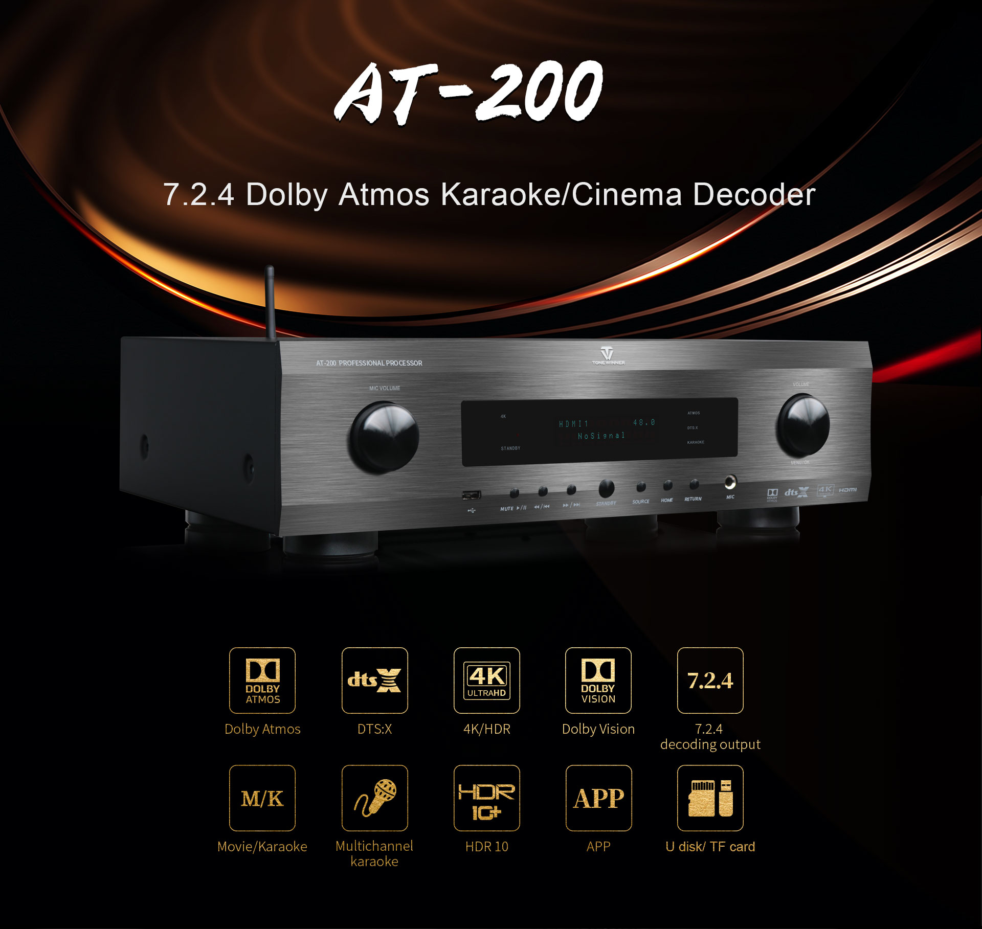 AT-200 هو نظام مسرح منزلي احترافي وكاريوكي مع جهاز فك تشفير صوتي ومرئي متكامل لإعداد الإصدار 7.1.4. هذا مضخم صوت أولي مع مخرج مضخم صوت فرعي يدعم نظام المسرح المنزلي تقنيات Dolby Atmos وDTS:X و4K وهو متوافق مع تقنية 3D وHDR10 وDolby Vision وغيرها من تنسيقات الفيديو. قنوات احترافية 7.1.4 تأثير كاريوكي غامر ويدعم المؤثرات الصوتية الخارجية.