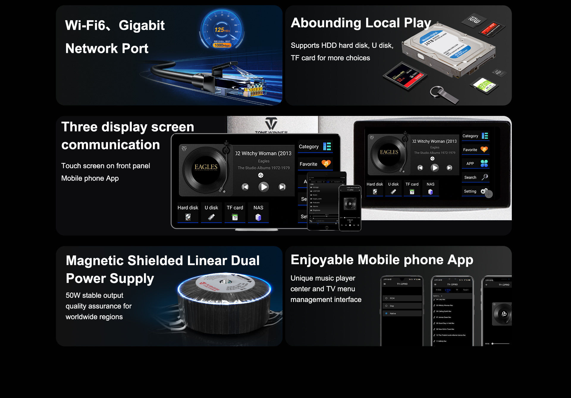 TY-i2PRO هو مشغل بث شبكة قوي وشامل، وهو مشغل صوت Hi-Fi عالي الجودة يستخدم تقنية Hi-Fi الخاصة بشركة Tonewinner لإخراج إشارات الصوت مباشرة، مما يعني أن إشارة الصوت من TY-i2PRO لن تتأثر بساعة النظام، والصوت من TY-i2PRO لا يزال في مستوى صوت HiFi بدون فقدان.